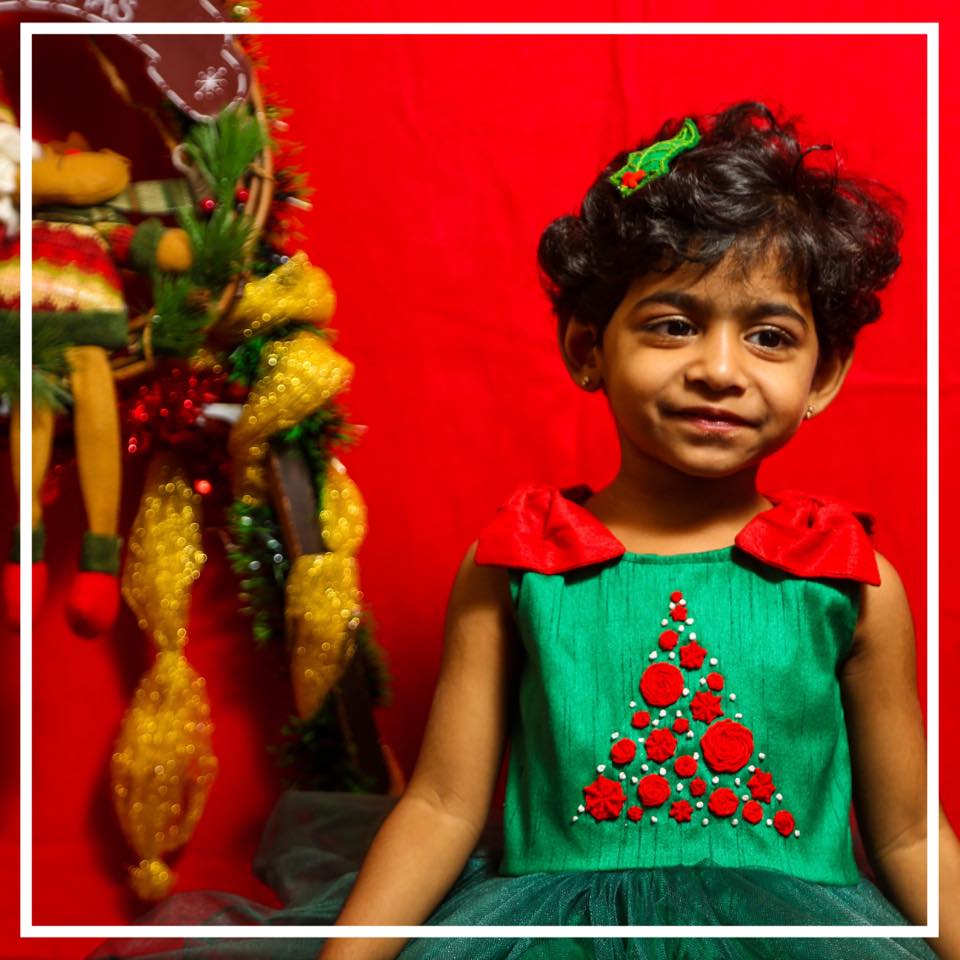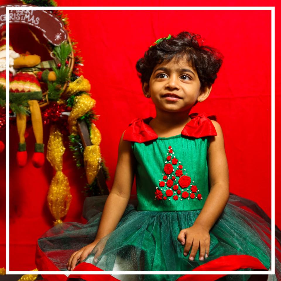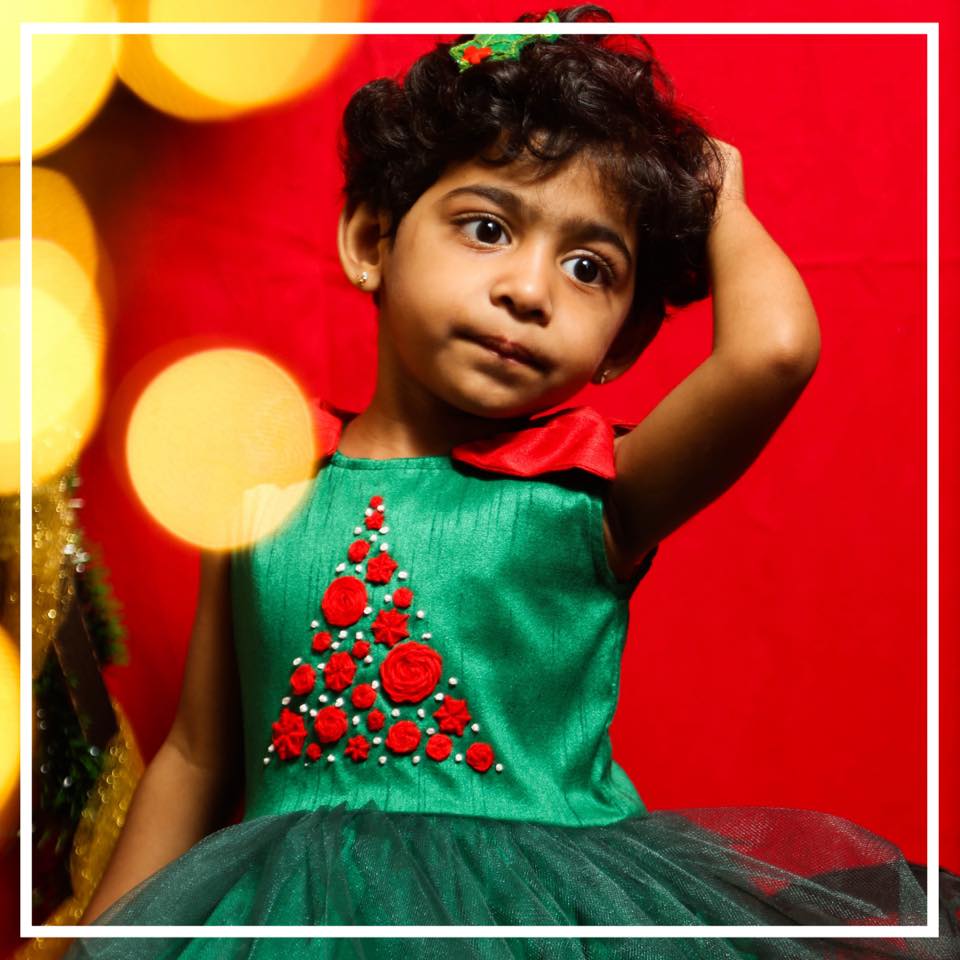 Adorning the bodice is a distinctive Christmas tree appliqué made up of red floral decorations and small round baubles.