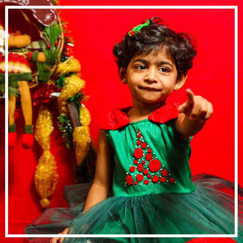 The dress is designed with a playful and joyful aesthetic, perfect for holiday celebrations.