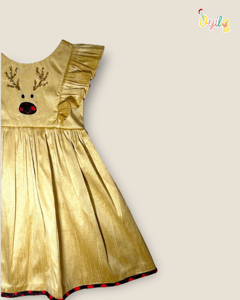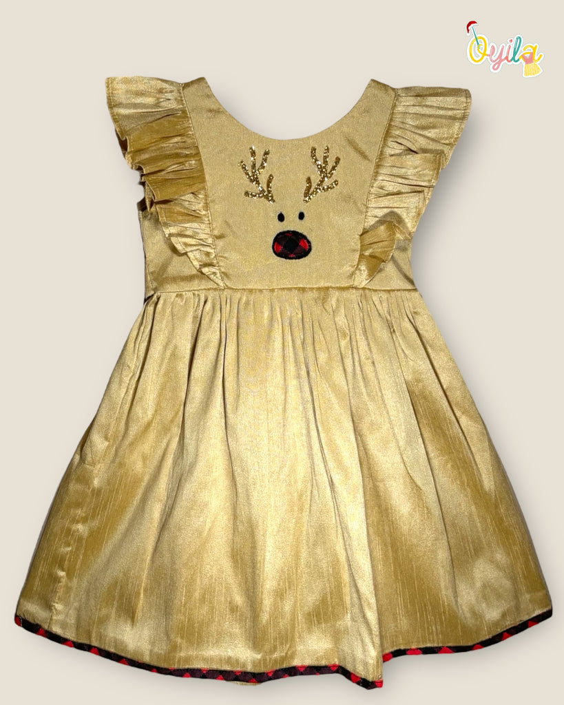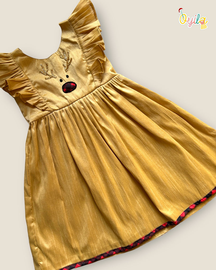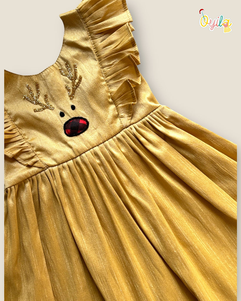 The dress is a rich golden color with a ruffled collar extending from the front to the back. Embroidered on the chest area is a reindeer face with antlers, eyes, and a red nose, resembling the popular character Rudolph the Red-Nosed Reindeer.