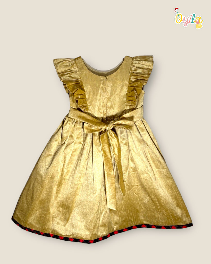 The dress has a gathered waist, creating a full skirt that flares out. The hem of the dress is trimmed with a plaid pattern in red and black, providing a nice contrast to the gold fabric.