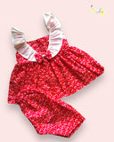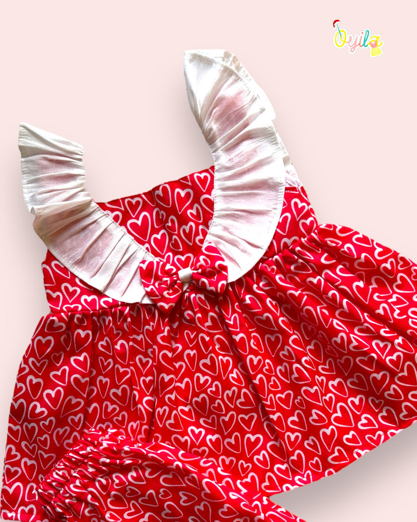 A two-piece set with a pink base and white hearts on it. The top has a flared silhouette with a large ruffled collar.