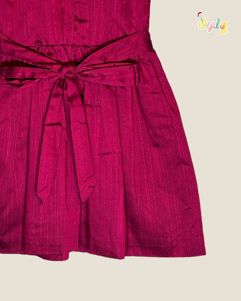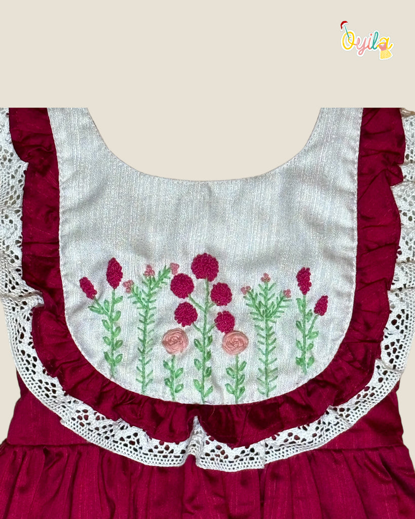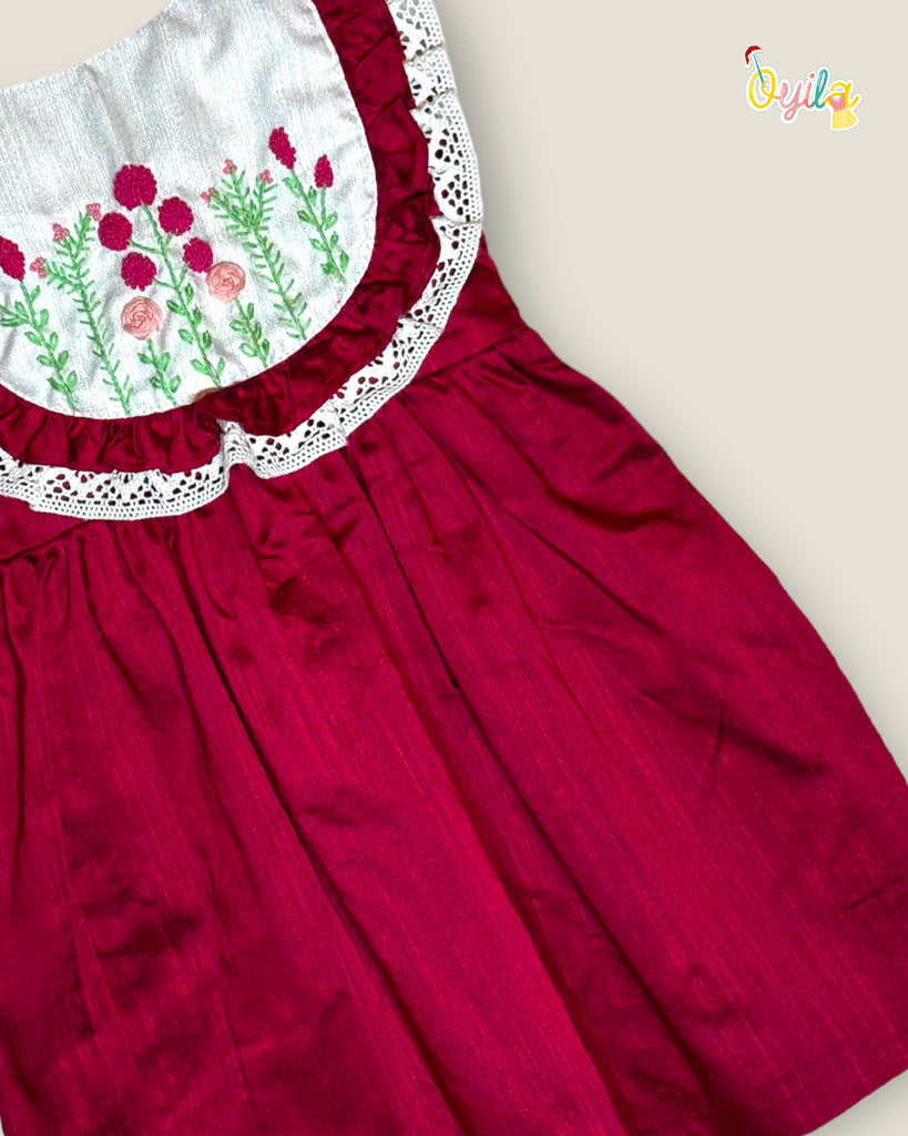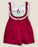 Features a vibrant wine skirt and a white bodice with an eye-catching floral embroidery in Christmas colors of deep pink and green.