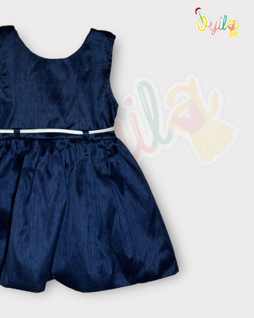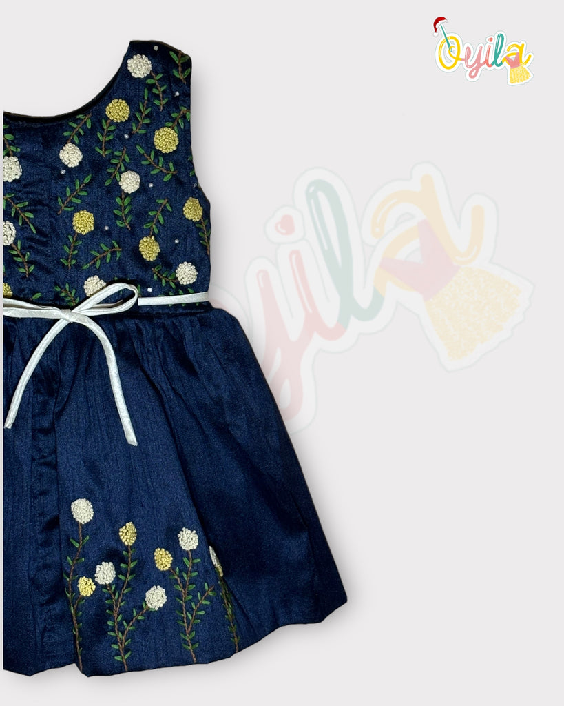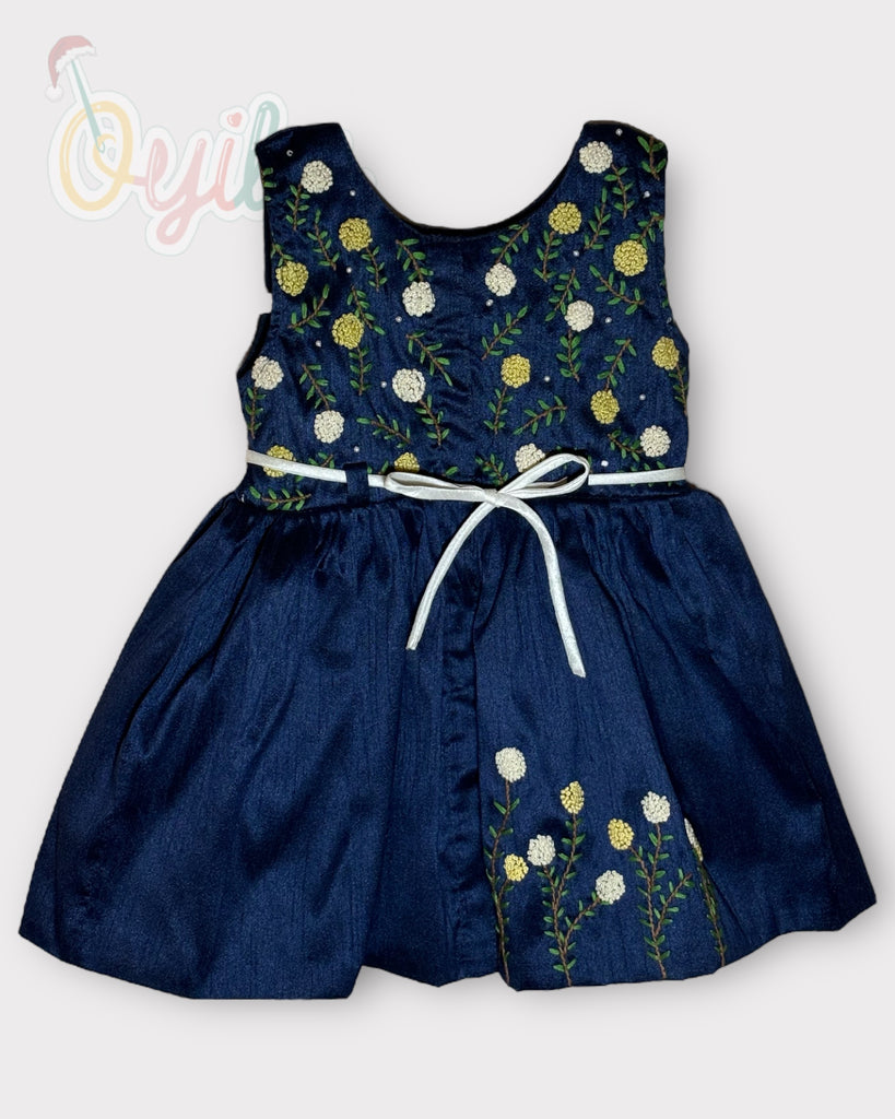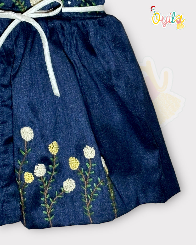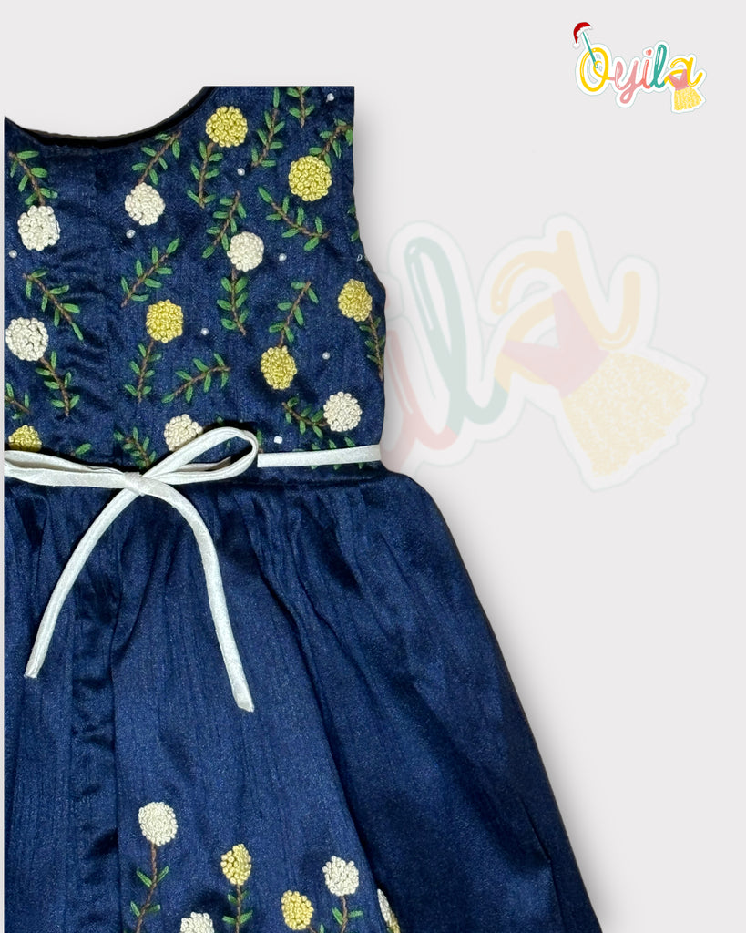 Featuring a dark blue, raw silk-based fabric with a sleeveless bodice. The top is embellished with a pattern of gold and white poinsettias, accompanied by green leaves, which adds to the festive appearance.