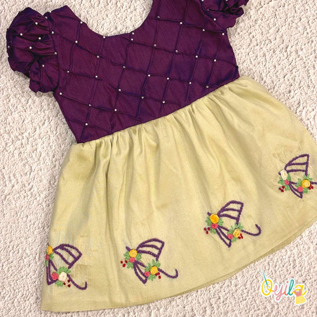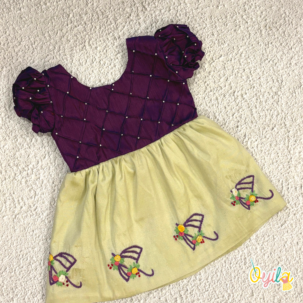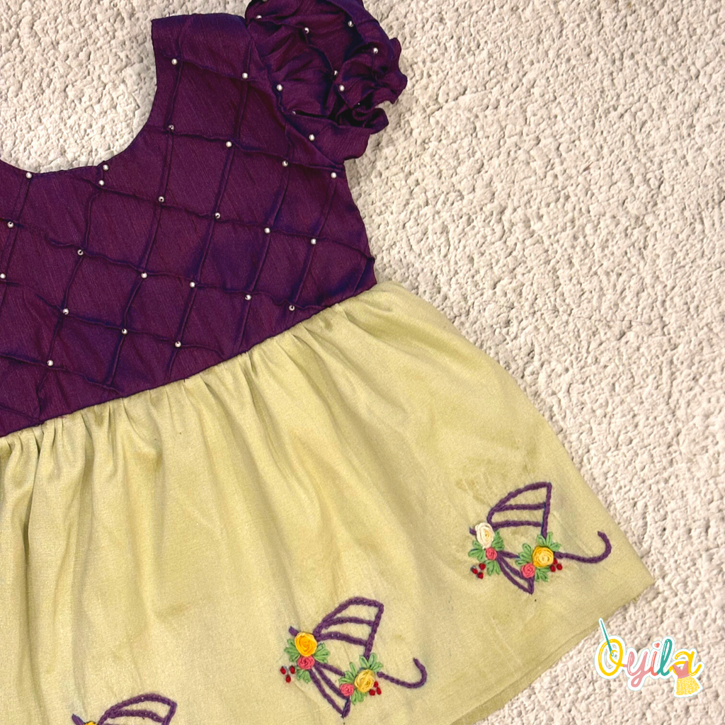 The dress is fully cotton lined.Pin tucks on the top portion and hand embroidery on the skirt portion.Comes with a bow at the back