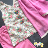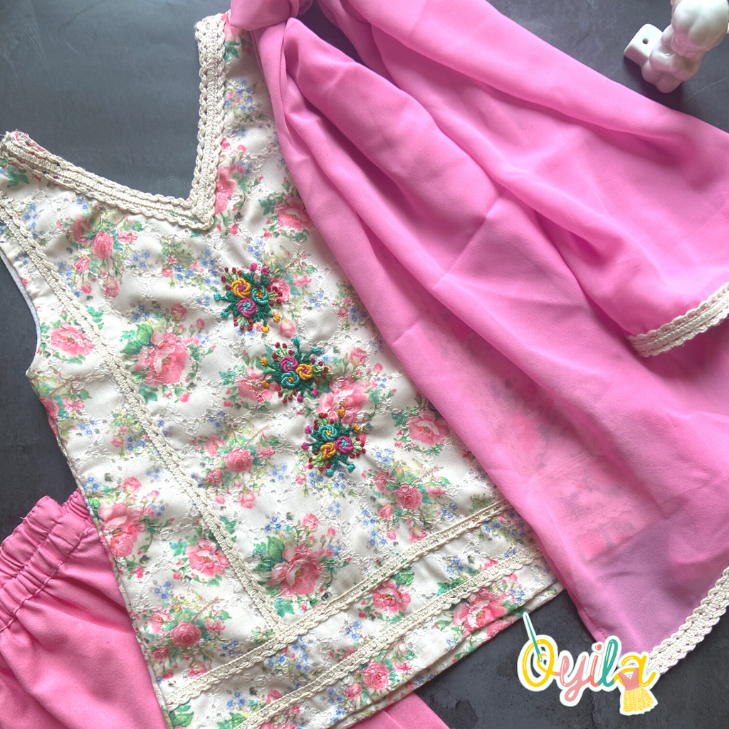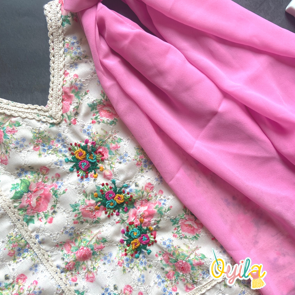 The top is lined entirely with cotton and features hand embroidery and lace detailing. It comes with a matching shawl.