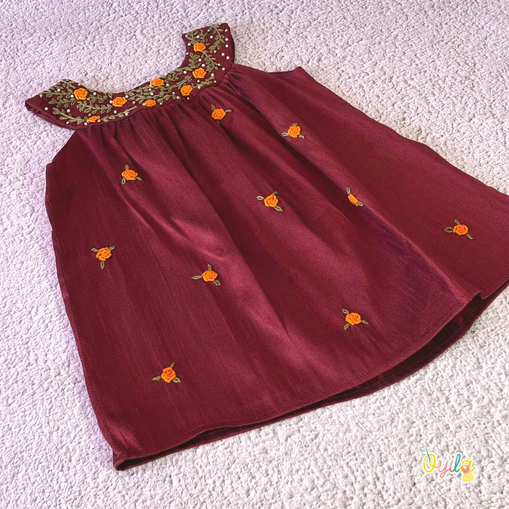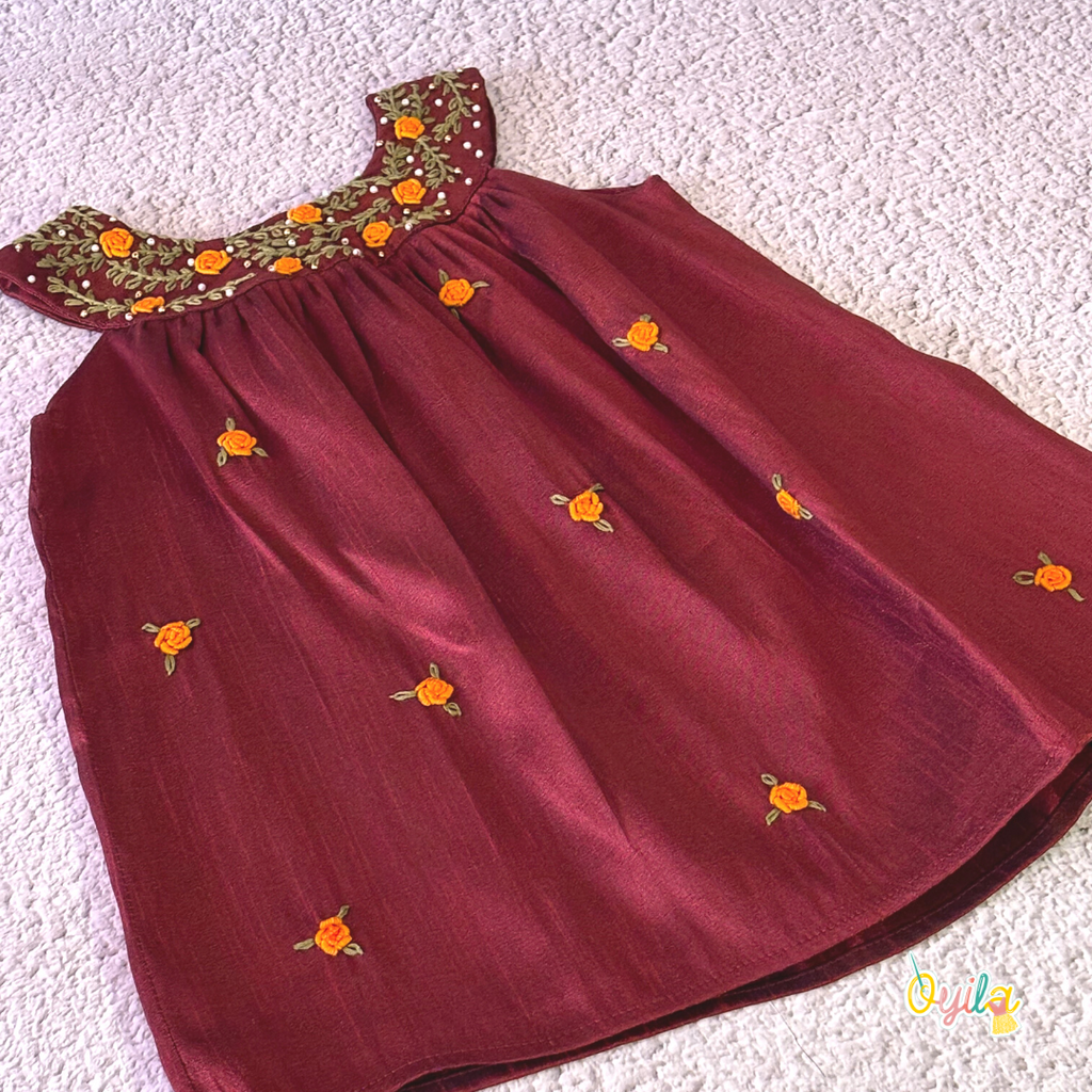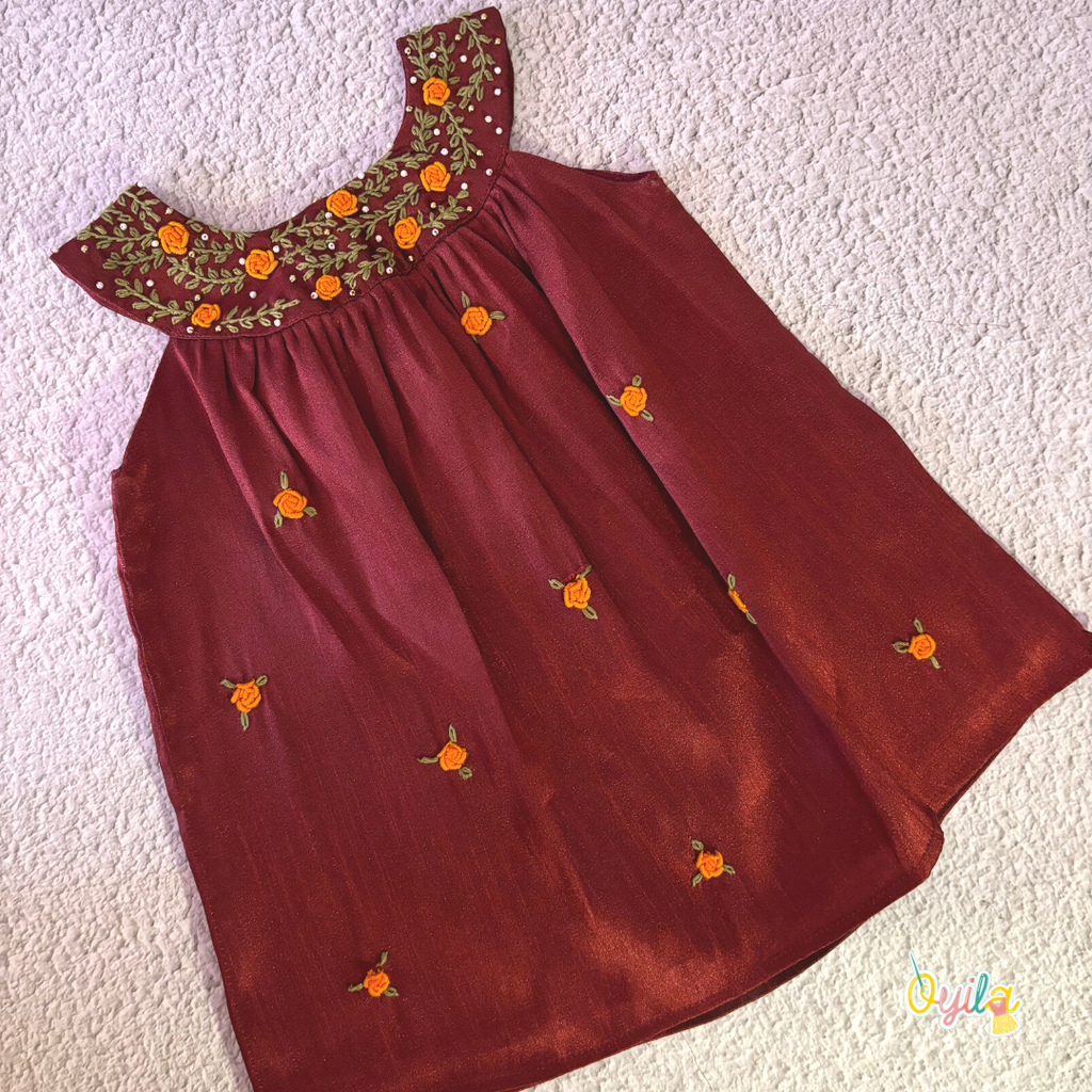 A simple yoke frock with beautiful roses embroidered around the yoke.The dress is cotton lined.Can be custom made in other shades as well.For minor customisations please leave a comment in the notes section.
