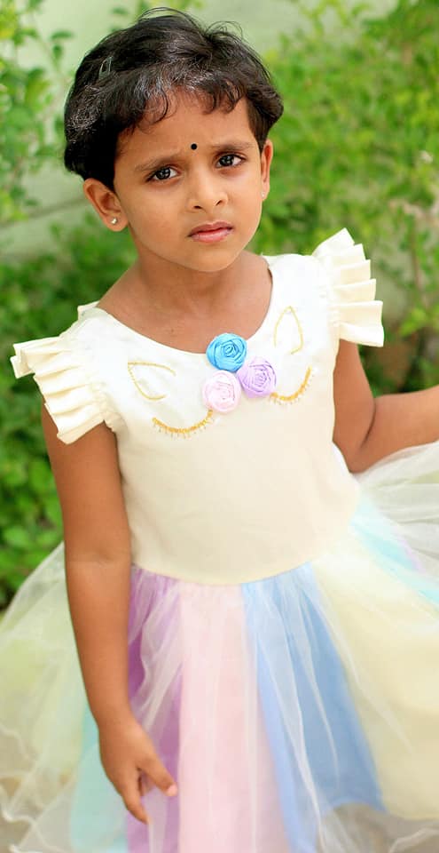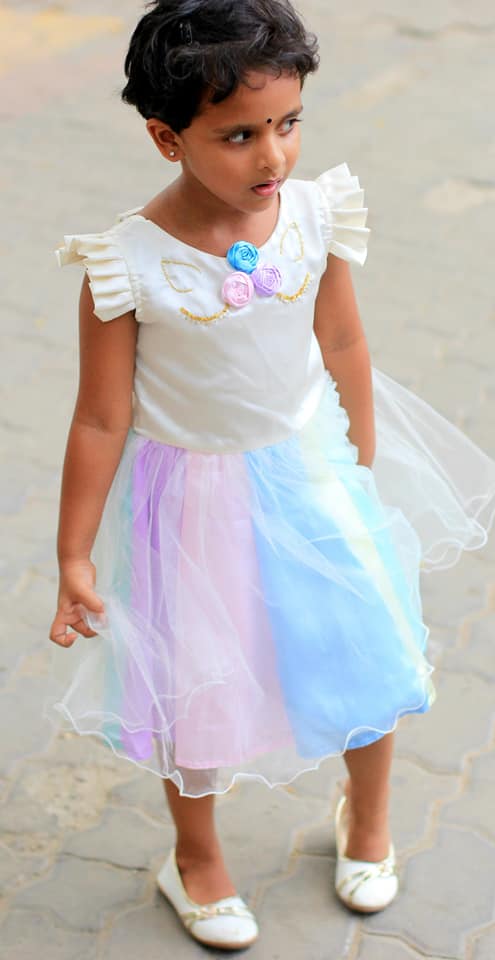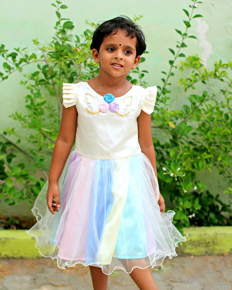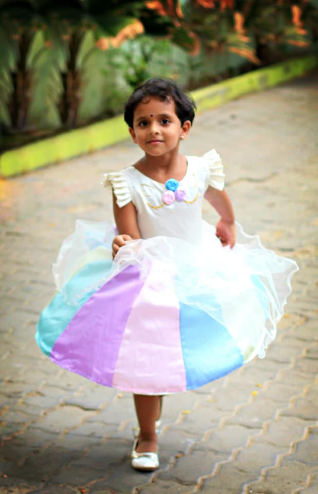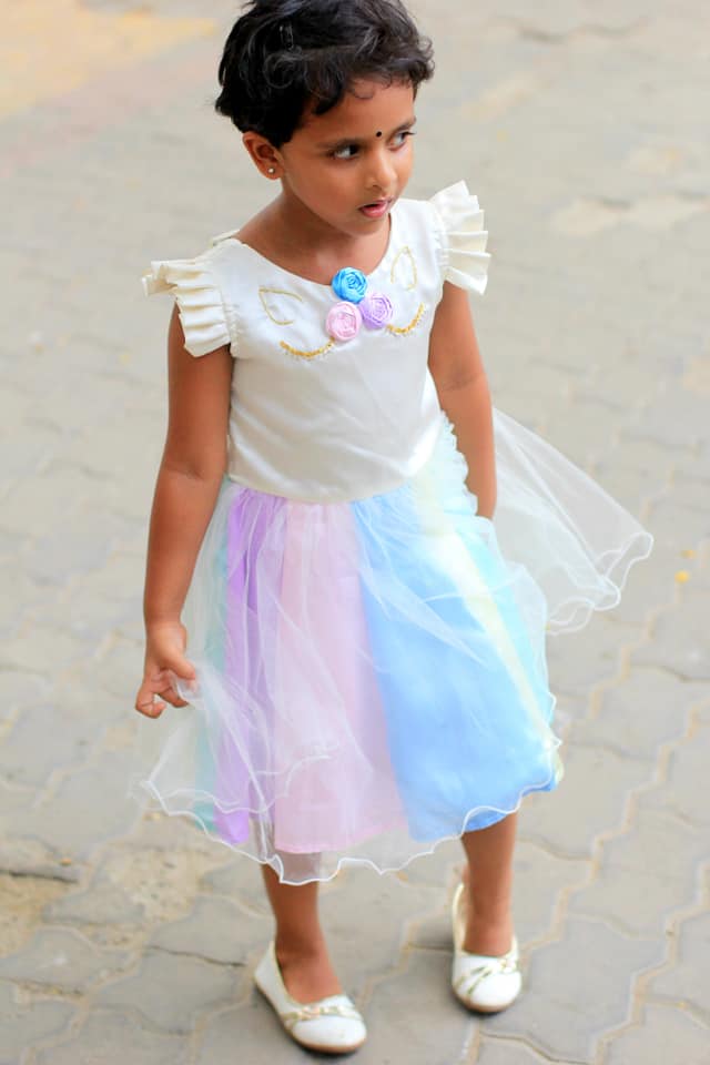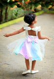 This is a whimsical dress featuring ruffled cap sleeves and a white bodice adorned with pastel rosettes and golden leaf embroidery. The skirt cascades in soft tulle layers with a pastel rainbow gradient, finished with a playful white ruffled hem.