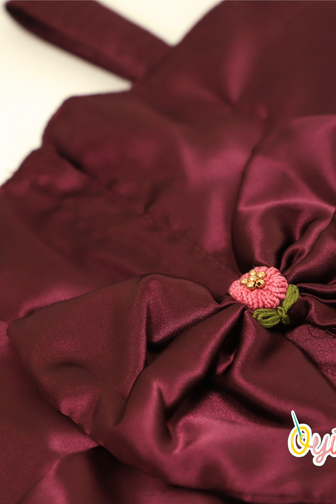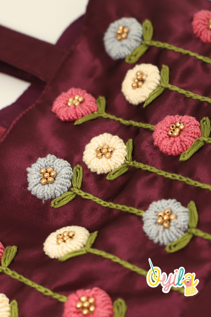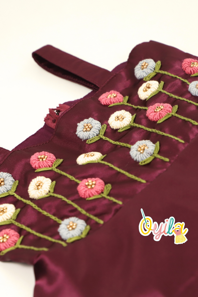 "Enchanted Garden,"  features a rich, deep purple satin bodice with thick shoulder straps for comfort. The bodice is adorned with an array of beautifully embroidered flowers in soft pinks, blues, and creams, each with intricate details and golden stems that seem to grow from the waistline.