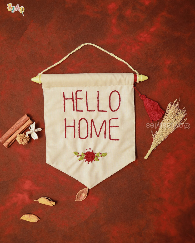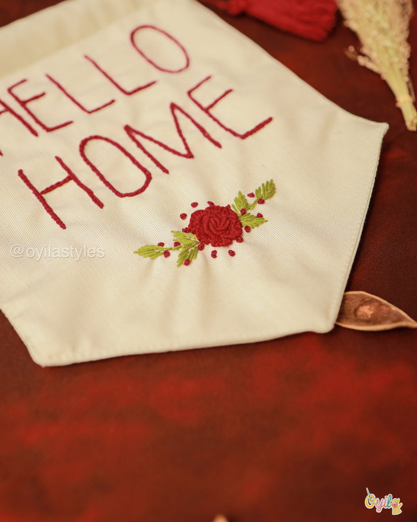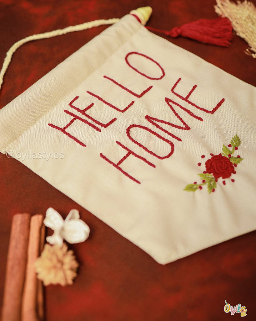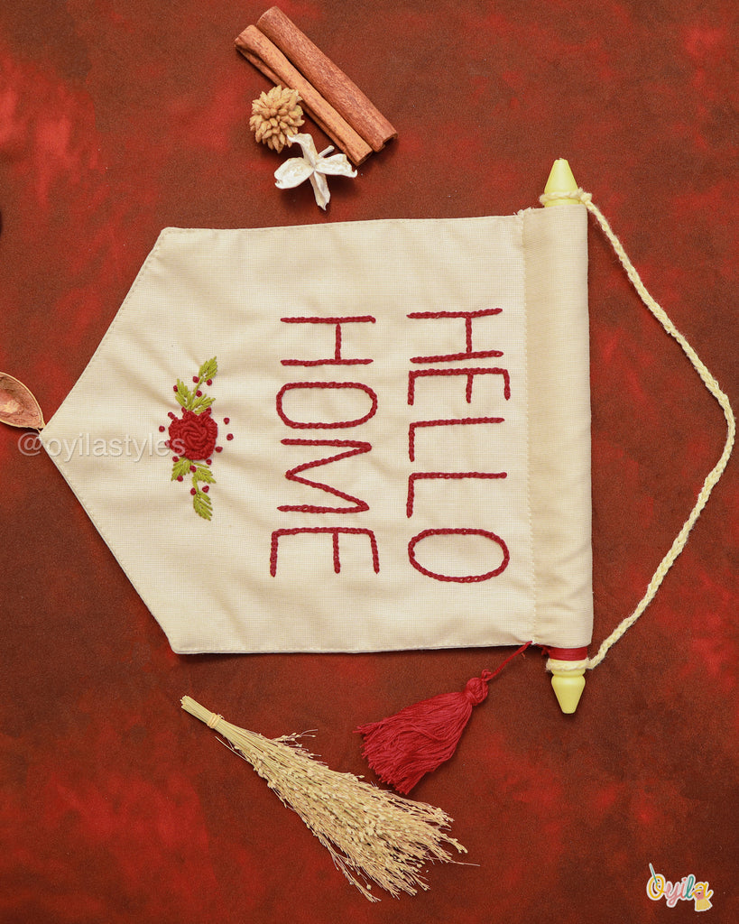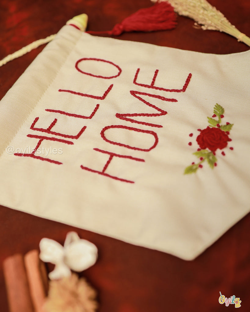 Featuring the cheerful message "Hello Home" in vibrant red thread, along with a delicate floral accent, this handmade piece adds a cozy, personal touch to any room. Perfect for entryways or as a housewarming gift, it effortlessly combines traditional craftsmanship with modern, minimalist decor.
