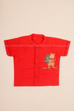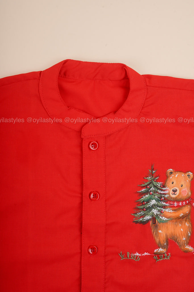 A bright red shirt with a mandarin collar and adorable hand-painted bear holding a snow-covered Christmas tree. Designed for comfort and a touch of holiday magic, this outfit is perfect for spirited celebrations.
