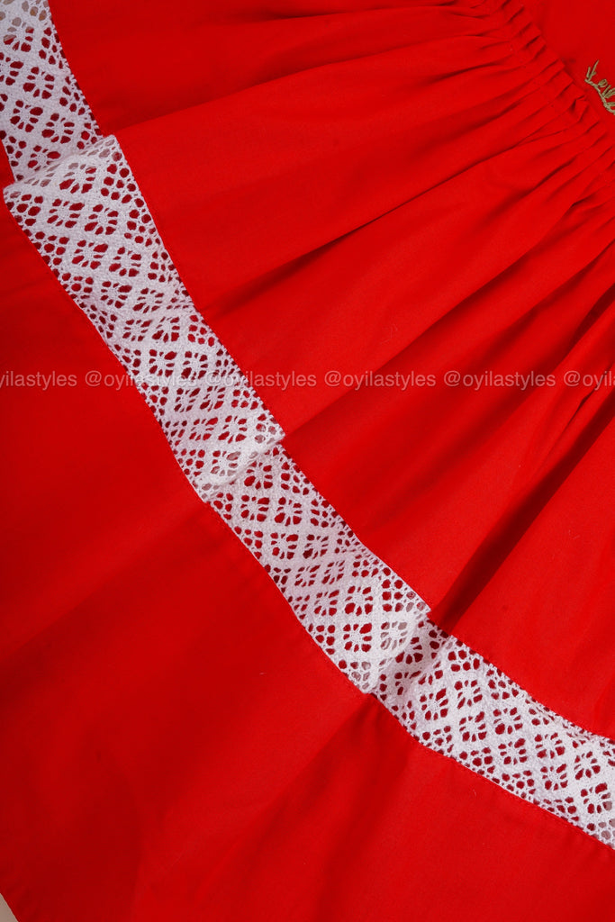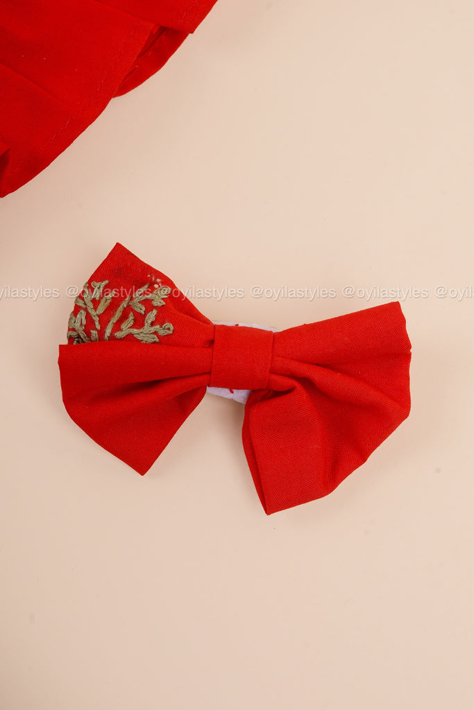 A delightful red frock with ruffled shoulder details and intricate lace trim on the skirt. The hand-painted bear motif adds a playful festive charm, while the matching bow completes this picture-perfect ensemble.