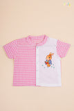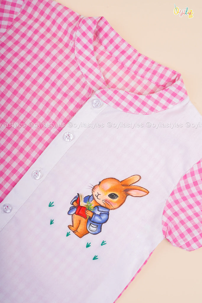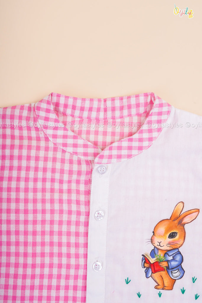 A charming pink gingham shirt with a mandarin collar, featuring a hand-painted bunny motif. Lightweight and breathable, it ensures comfort for active little ones during celebrations.