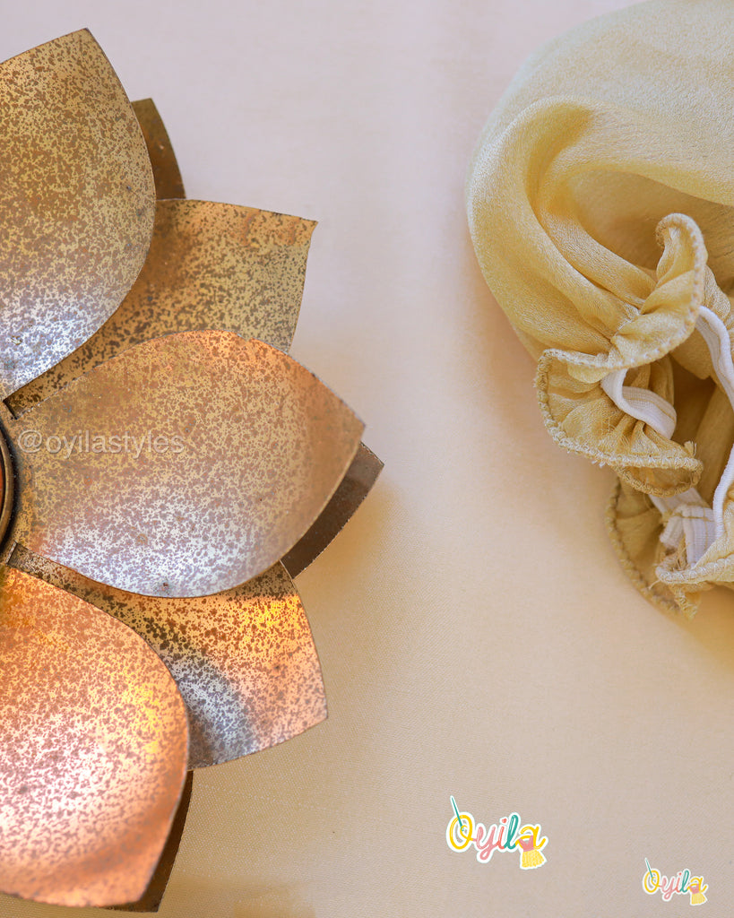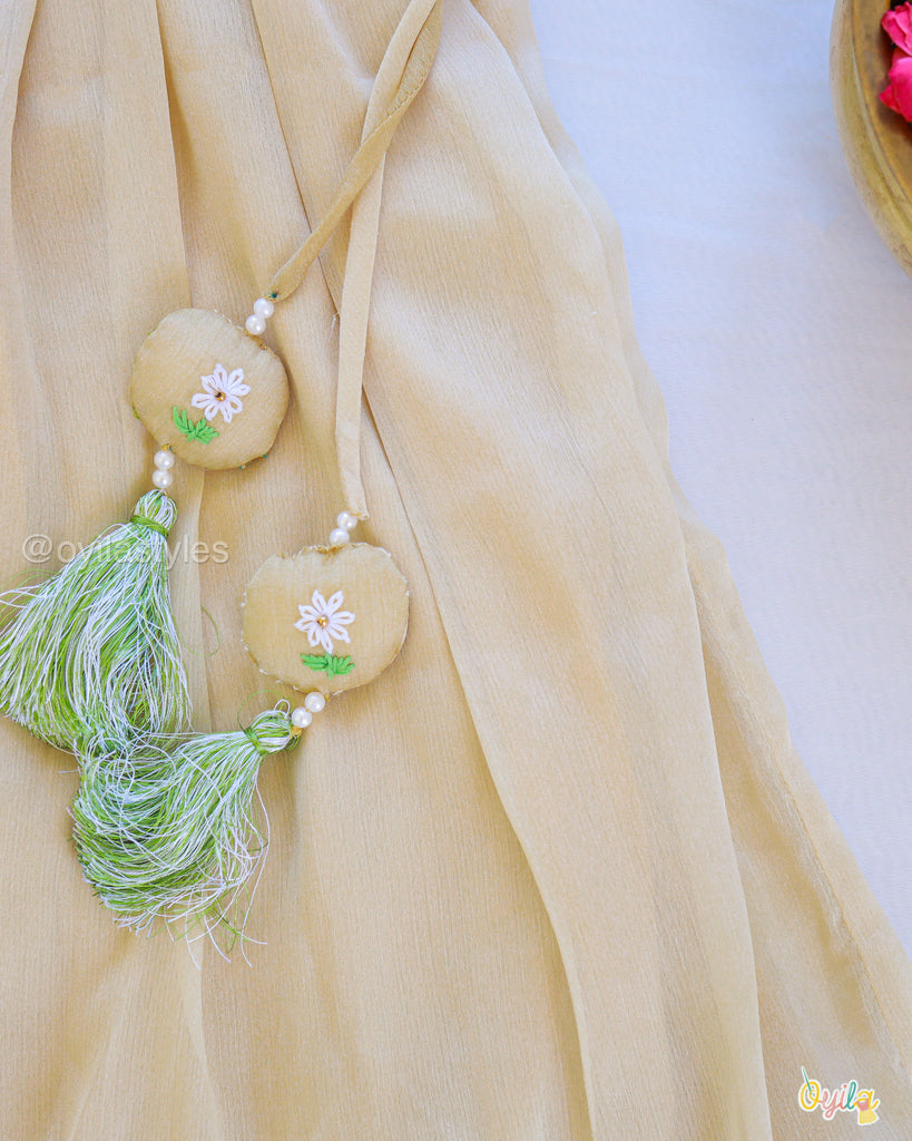 This outfit is a charming kids' lehenga set with a soft, pastel beige tone. The top features puffy, sleeves, adding a playful, voluminous touch to the design.
