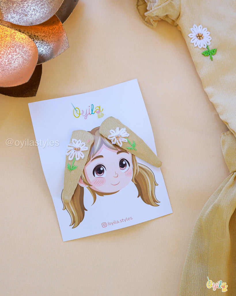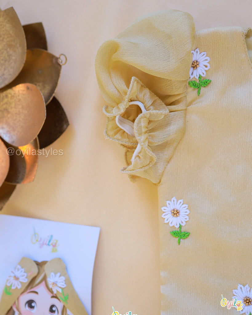 Embroidered daisies are scattered across the bodice, giving it a delicate and youthful feel. The lehenga skirt has a full, flared silhouette, with a flowy, lightweight fabric that complements the gentle vibe of the outfit. The subtle white hem at the bottom of the skirt adds a neat finishing touch