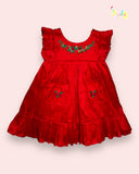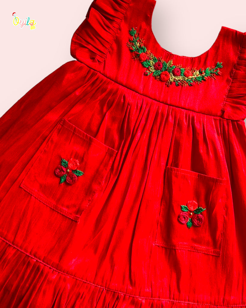 The dress is distinguished by its hand-embroidered details, which add a touch of artisanal charm and uniqueness.One of the prominent features is the use of bullion roses in the embroidery. Bullion roses are a type of embroidery stitch that creates a three-dimensional rose design, giving the appearance of tightly rolled rosebuds.