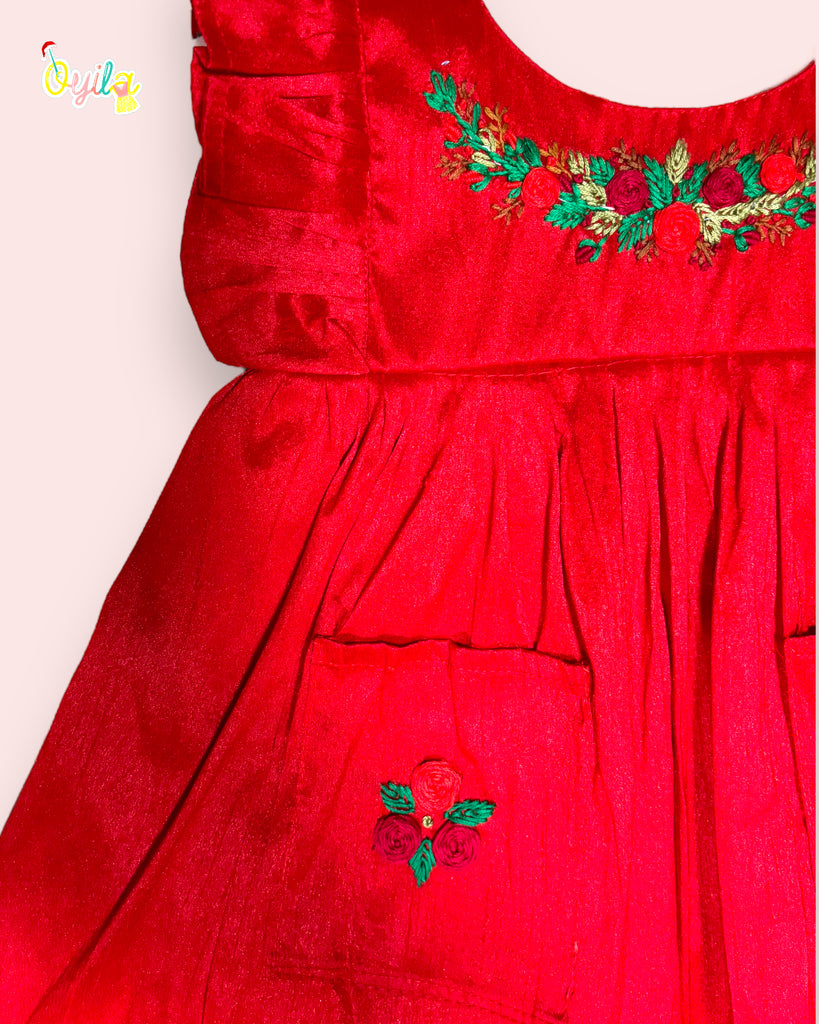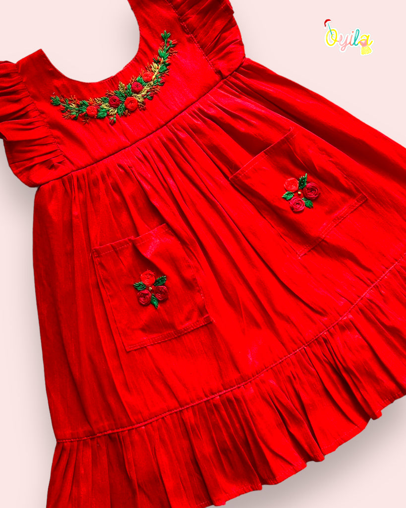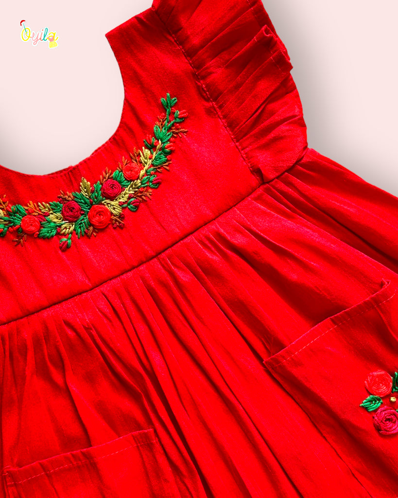 Surrounding the bullion roses are green embroidered leaves, creating a complete holly motif. Hand embroidery, especially of this quality, adds a luxurious and timeless element to children's clothing.