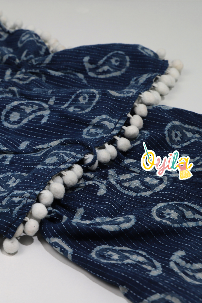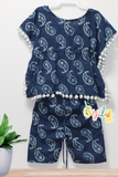It is embellished with charming white pom-pom trim along the sleeves and hemline, which adds a playful and Bohemian touch. The shorts complement the top with a similar fabric and print, ensuring a cohesive look.