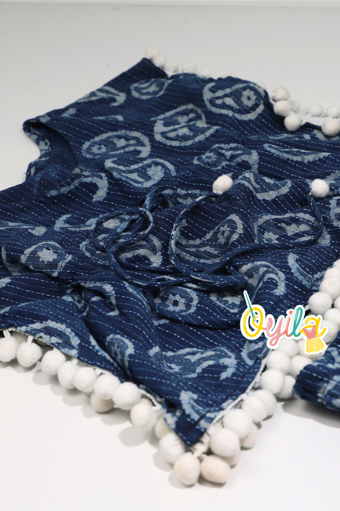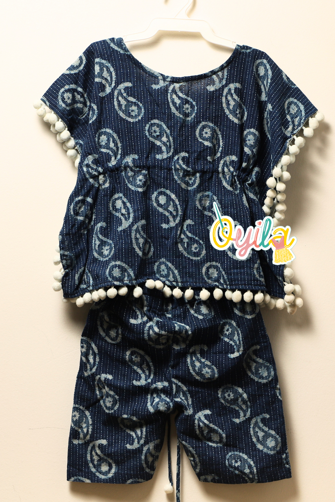 This ensemble features a caftan-style top paired with matching shorts in a traditional indigo and white paisley pattern.