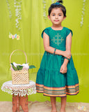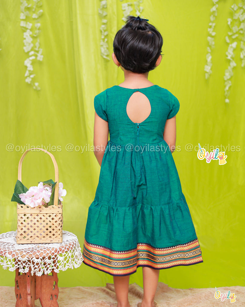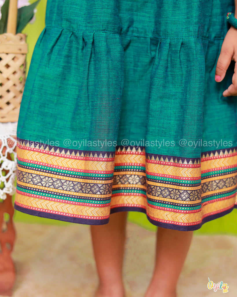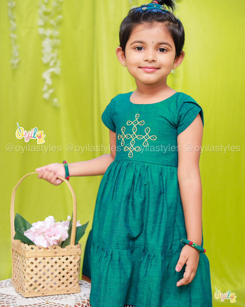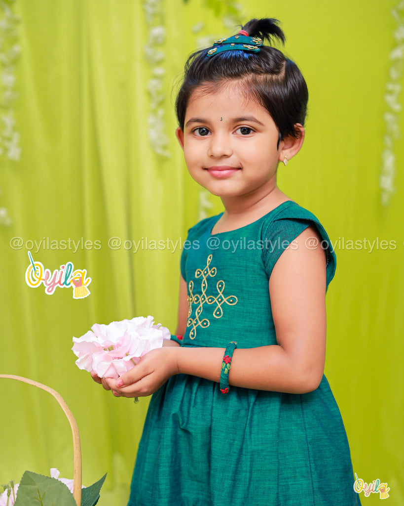 Yet another kolam outfit from Oyila, embodies simplicity and elegance with its deep green hue and traditional design.