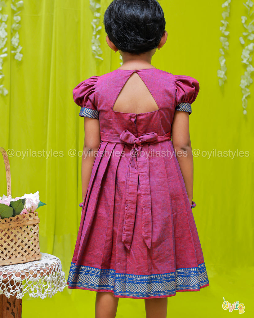 This outfit is a charming and festive traditional dress for kids, featuring a rich magenta color with a subtle sheen that adds to its elegance.