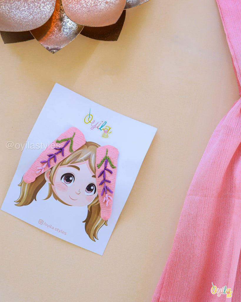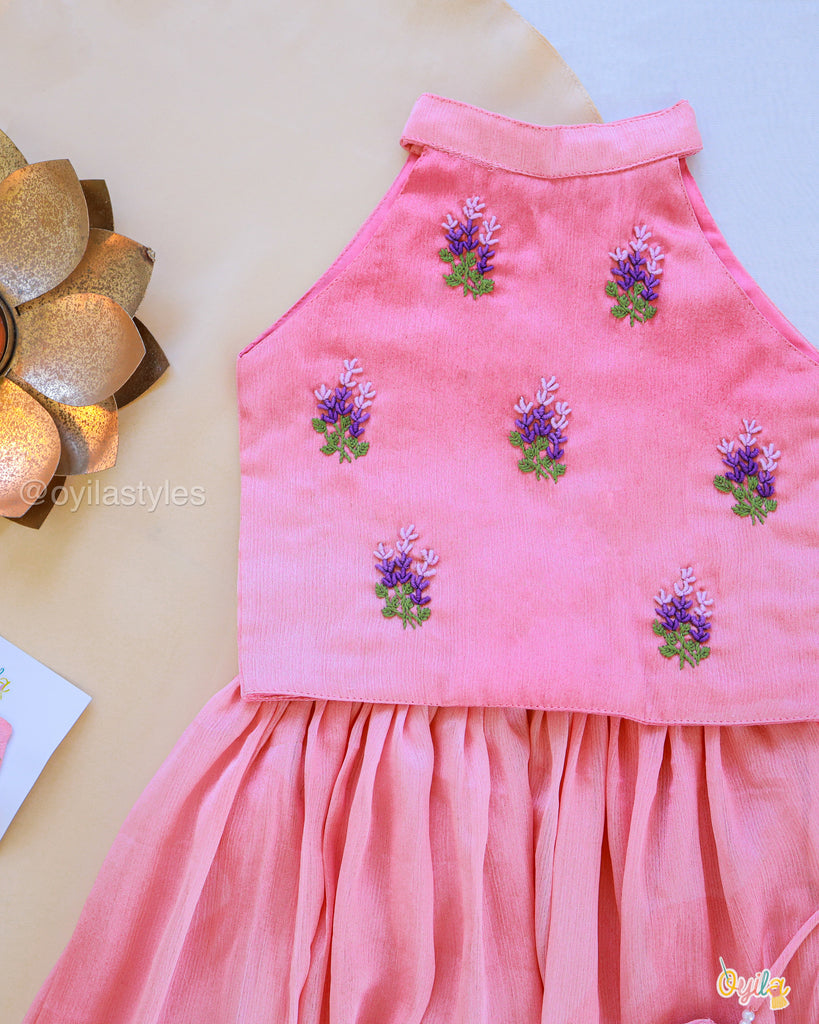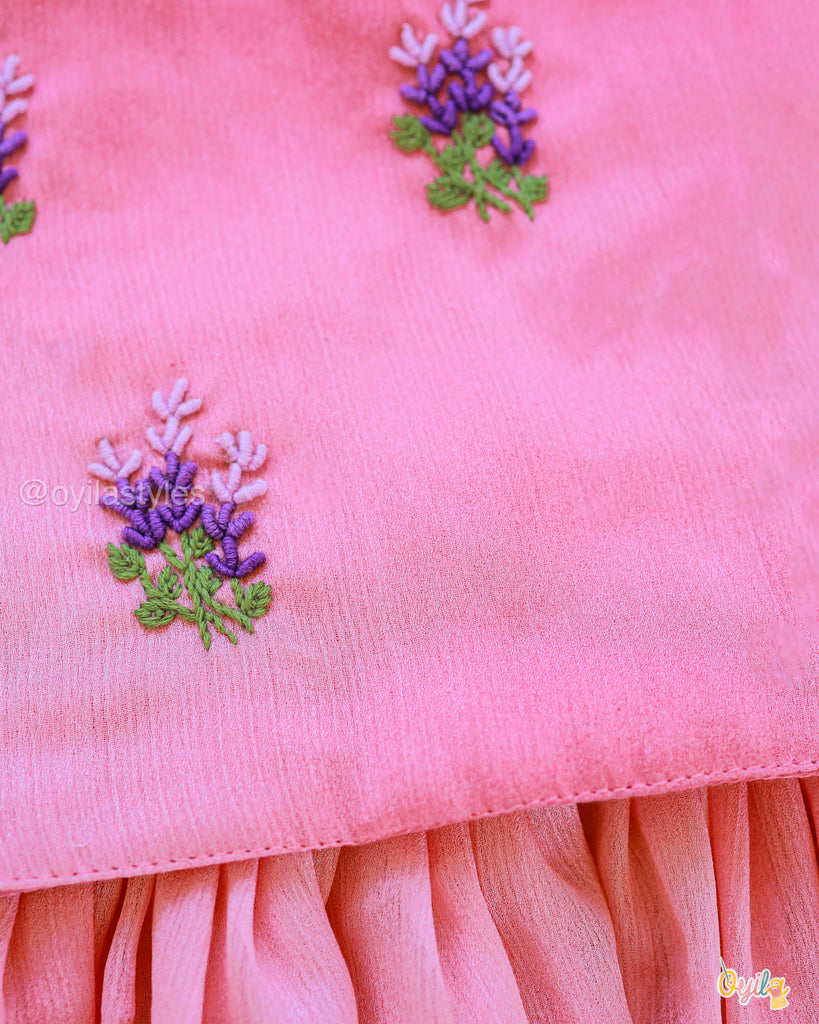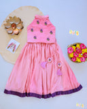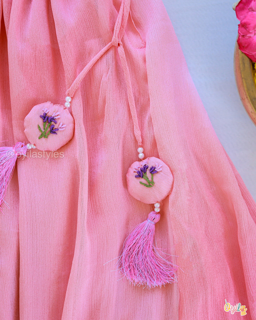 Neelamalli, a stunning kids' lehenga crafted in soft pink, adorned with delicate floral embroidery on the bodice. The flowy skirt features a subtle sheen with a contrasting purple hemline, adding elegance to the outfit. Complete with playful tassels, this ensemble is perfect for festive occasions, making your little one look effortlessly graceful and charming.