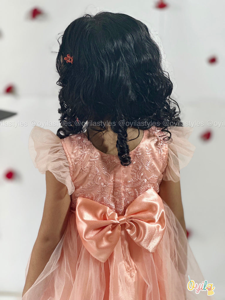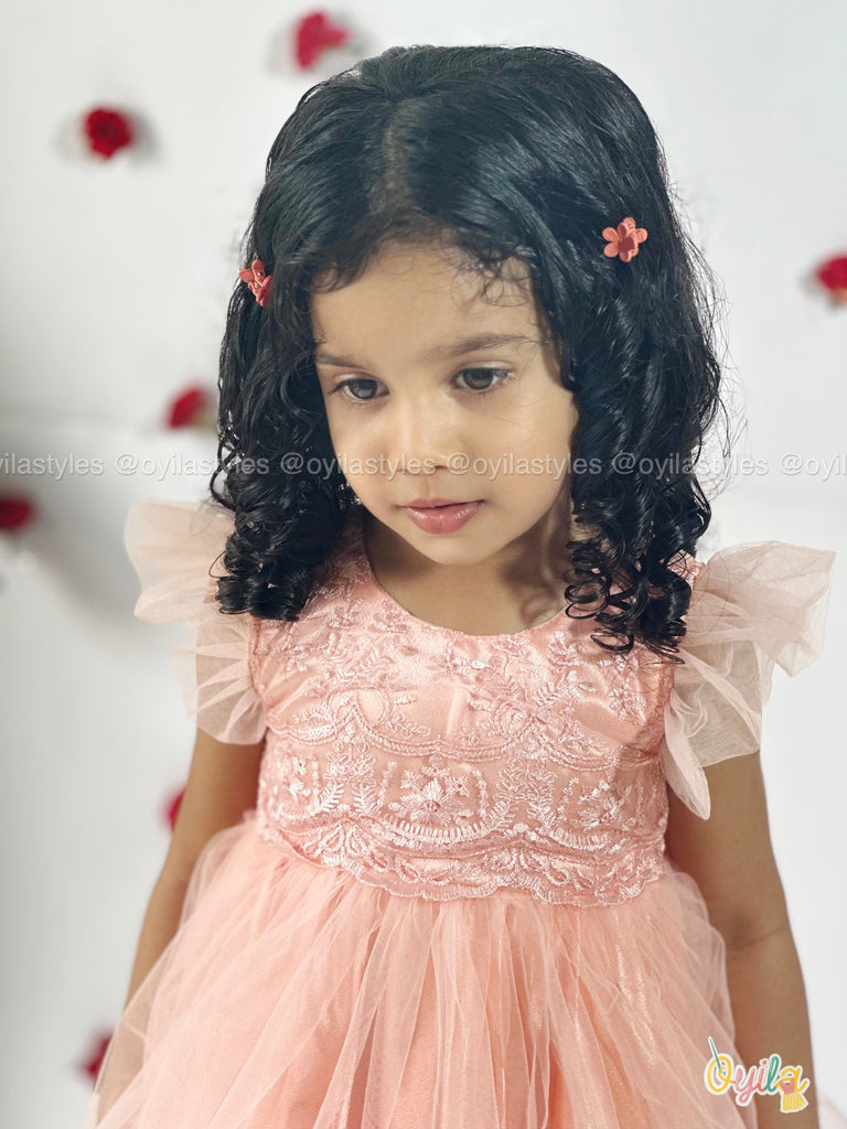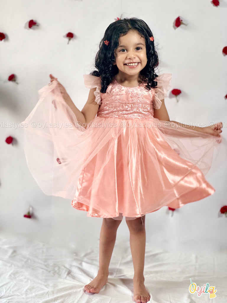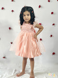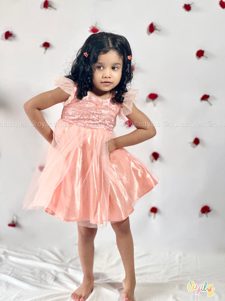 Add a touch of sparkle to her wardrobe with Peaches. This shimmery peach dress features layered net, puff sleeves, and a glittery bodice that shines with every move. Designed for comfort and flair, it’s the perfect party pick for your little star.
