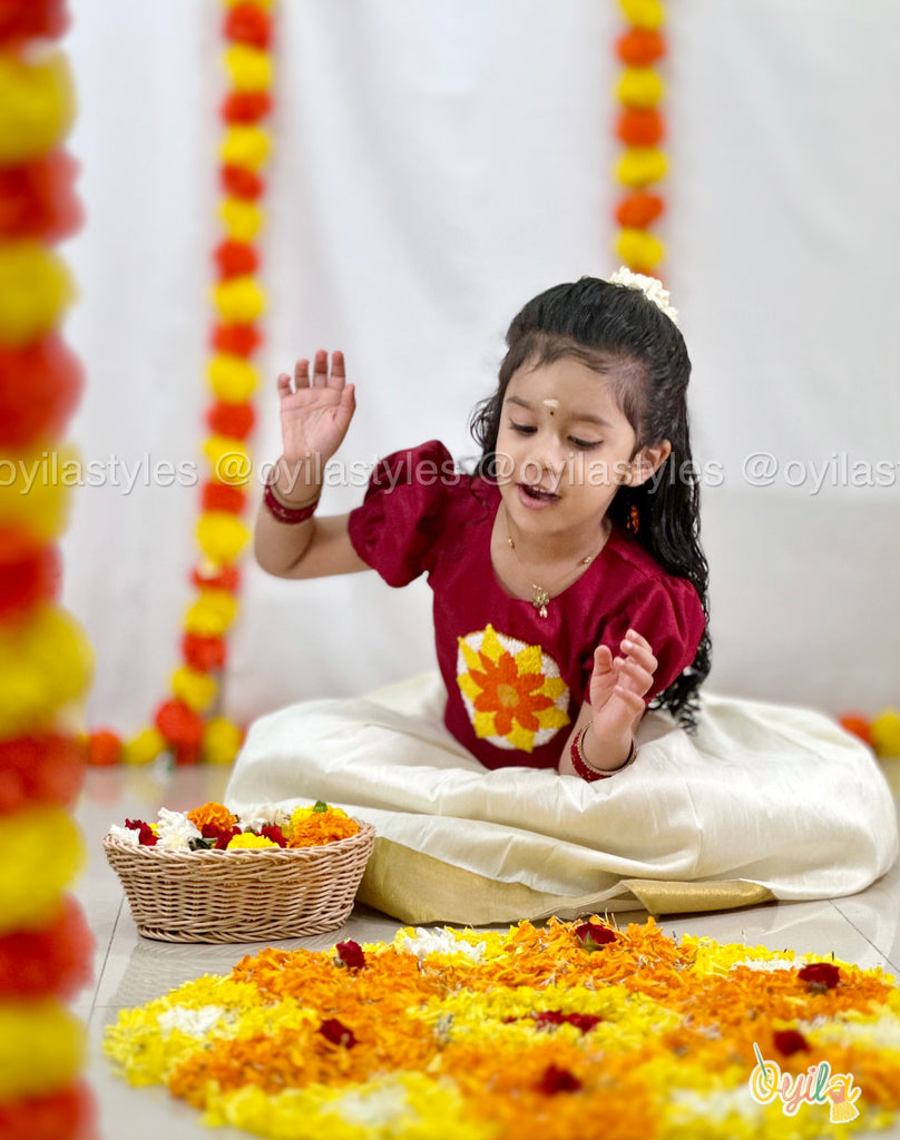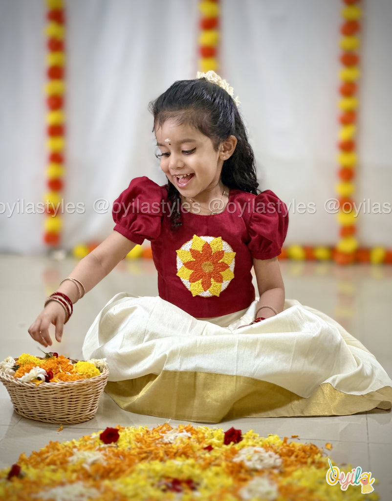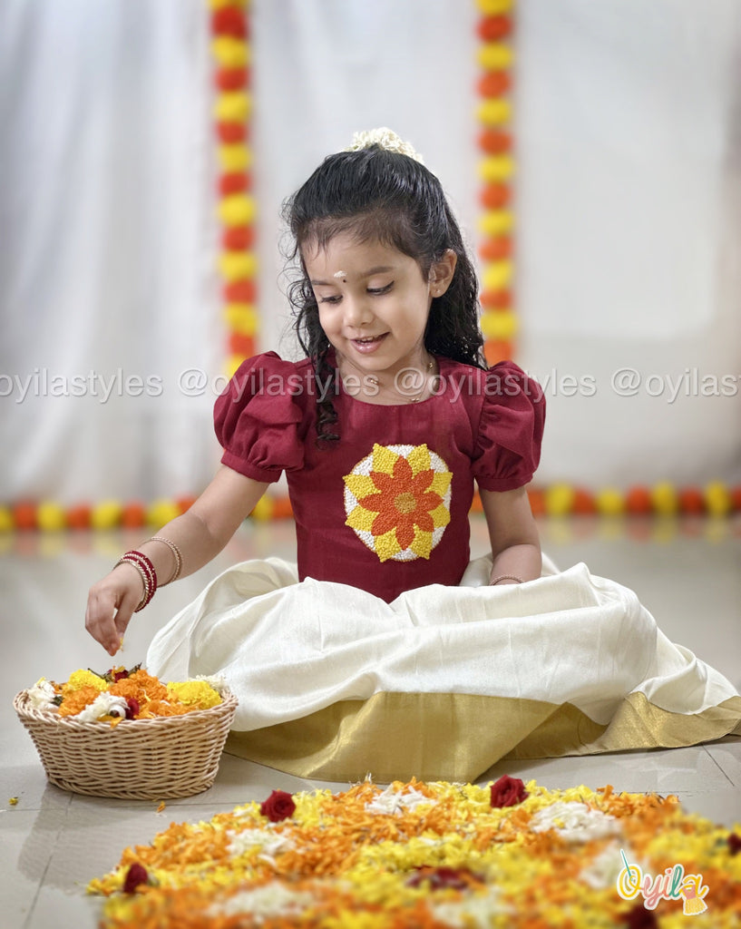 Celebrate tradition with a playful twist! This charming ethnic set features a rich maroon puff-sleeve blouse adorned with a vibrant hand-embroidered pookolam, adding a festive flair. Paired with a classic off-white pleated skirt finished with a golden border, the ensemble strikes a beautiful balance between elegance and comfort. Perfect for little ones during Onam celebrations.