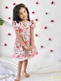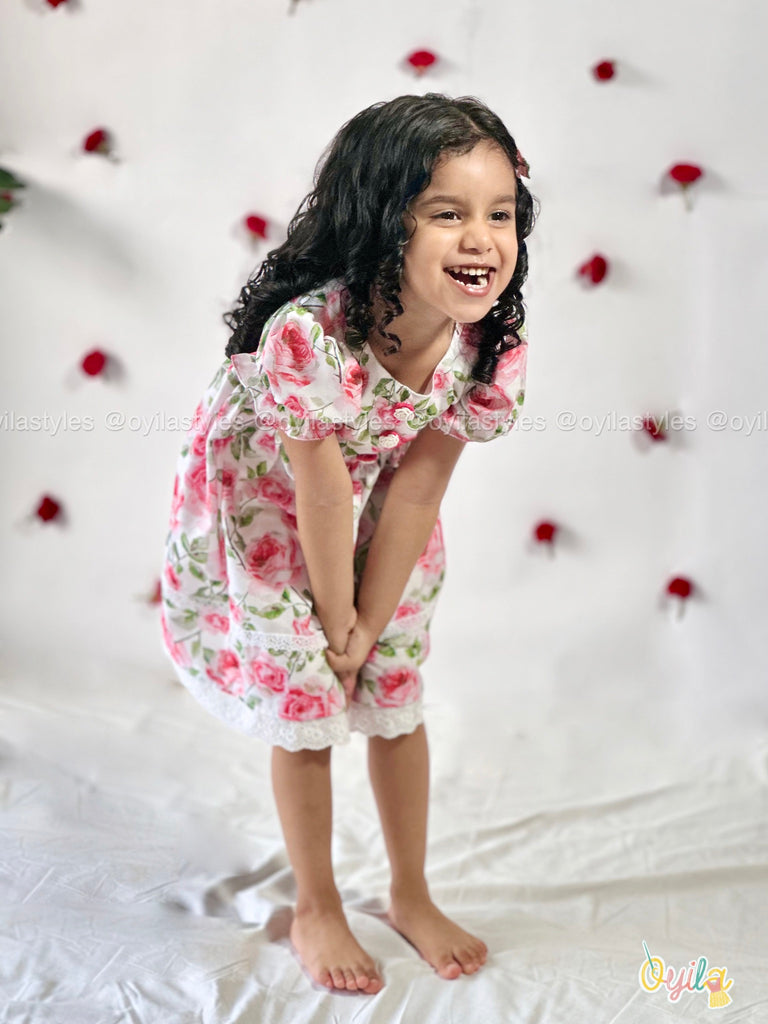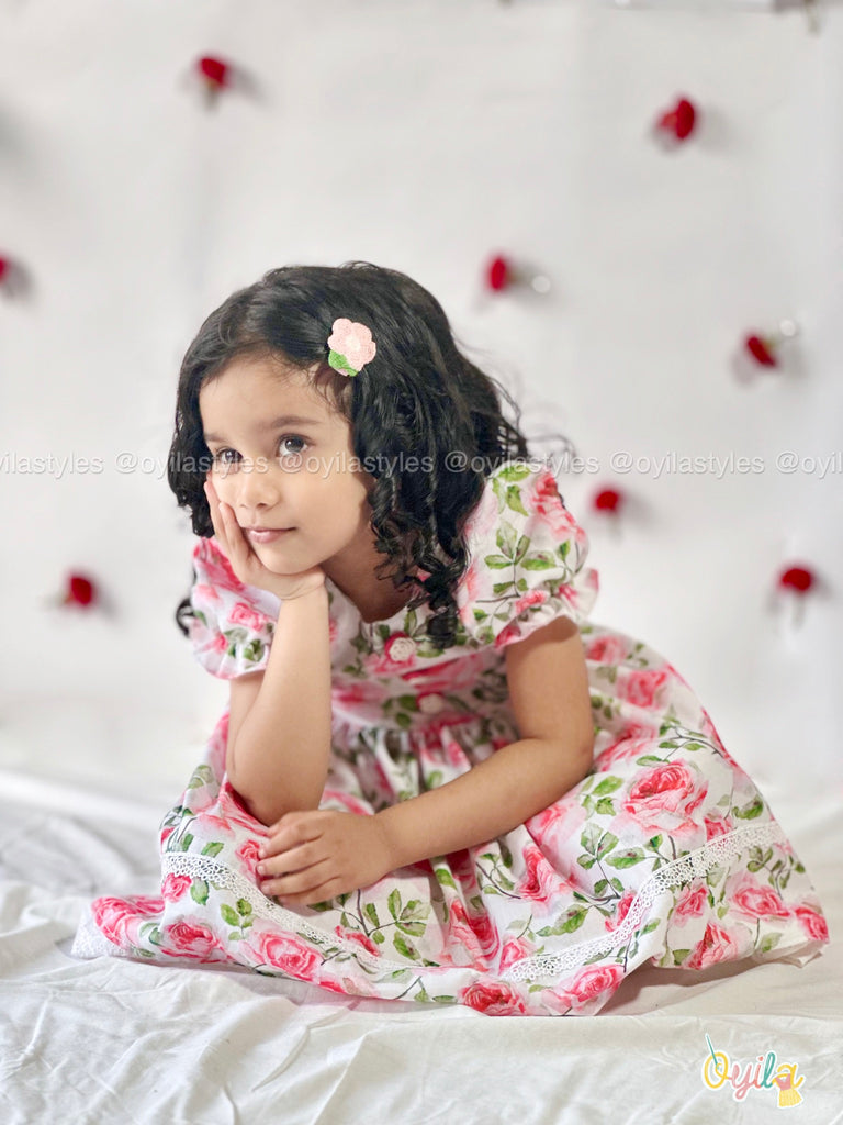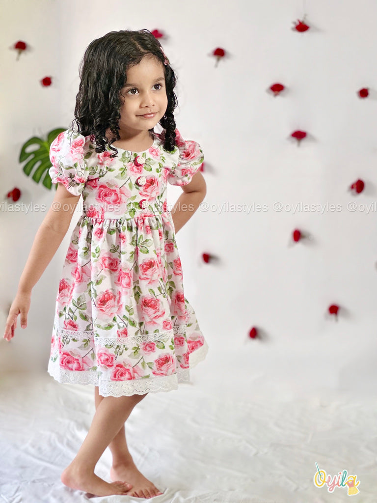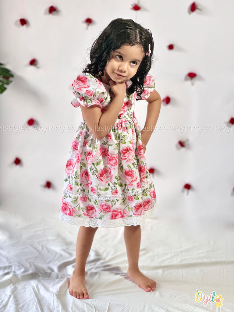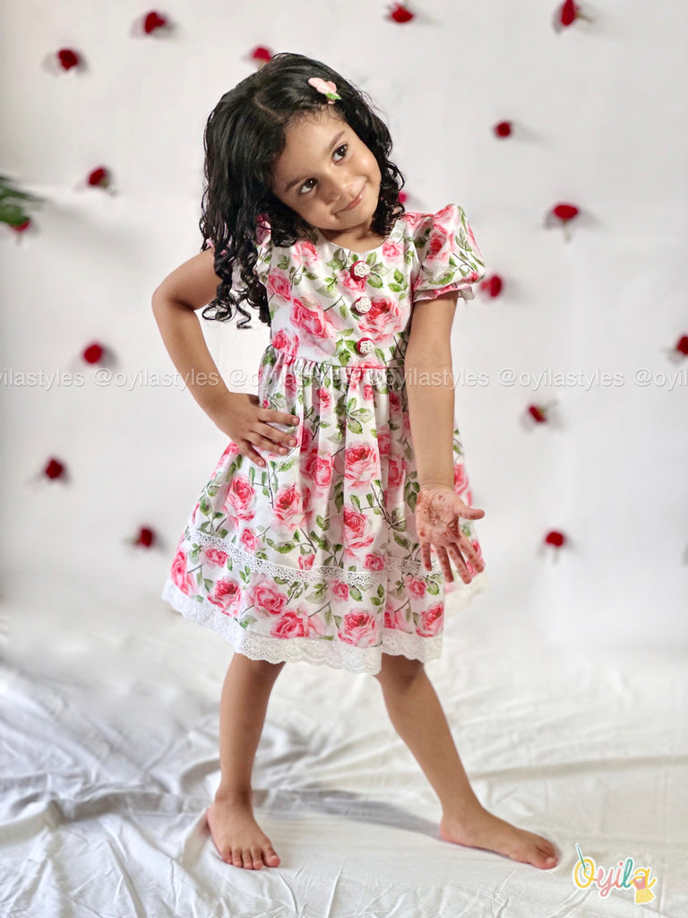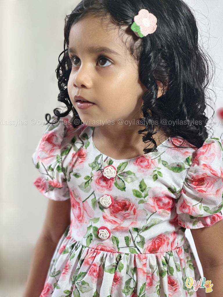Say hello to Rosette – a fresh burst of floral charm for your little one. This cotton dress is adorned with pink rose prints and delicate lace detailing along the hem and skirt, adding a vintage-inspired touch. Featuring puff sleeves and soft gathers at the waist, Roja is equal parts comfort and elegance – perfect for sunny days, family gatherings, and Easter brunches.Dont miss to notice those detailing on the buttons.