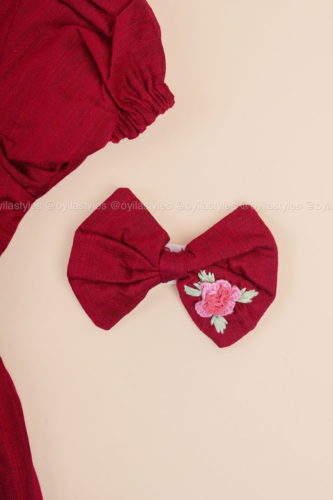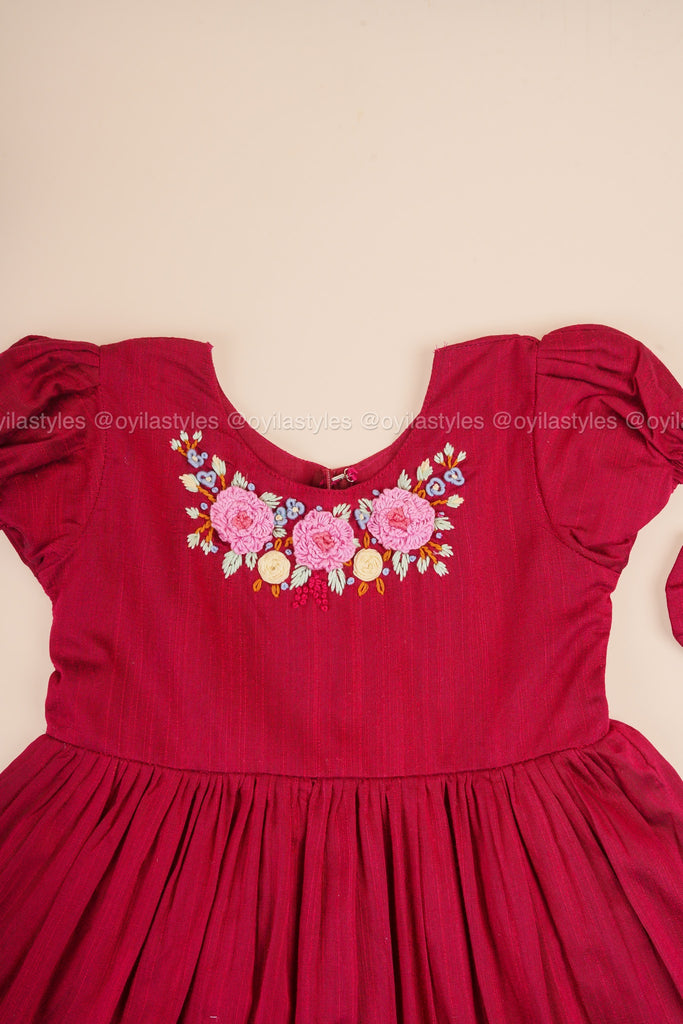 A charming berry dress with puffed sleeves, adorned with delicate floral embroidery on the bodice and hem. The subtle shimmer and contrasting border add a regal touch, complemented by a matching bow accessory.