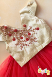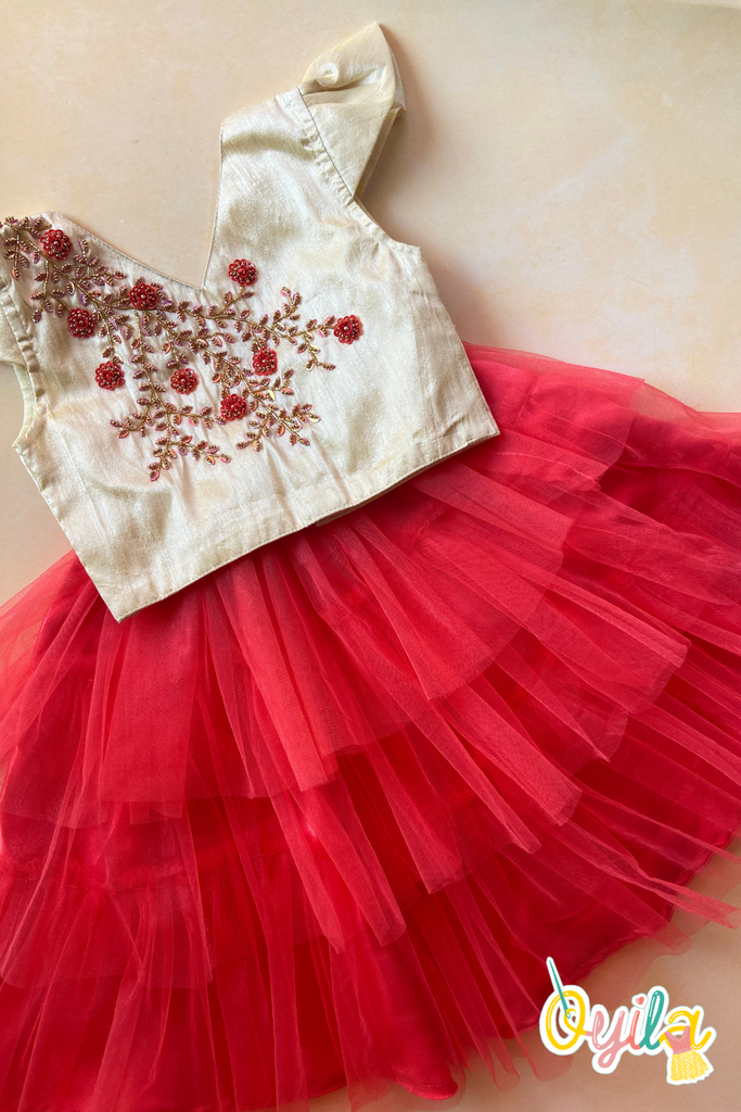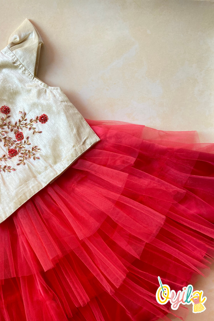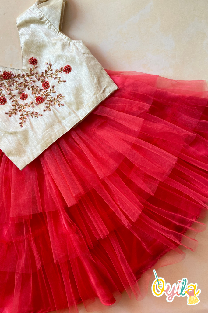 The top portion is made of a cream or light beige semi raw silk.The top is lavishly embellished with intricate embroidery, consisting of floral patterns with red and golden details.