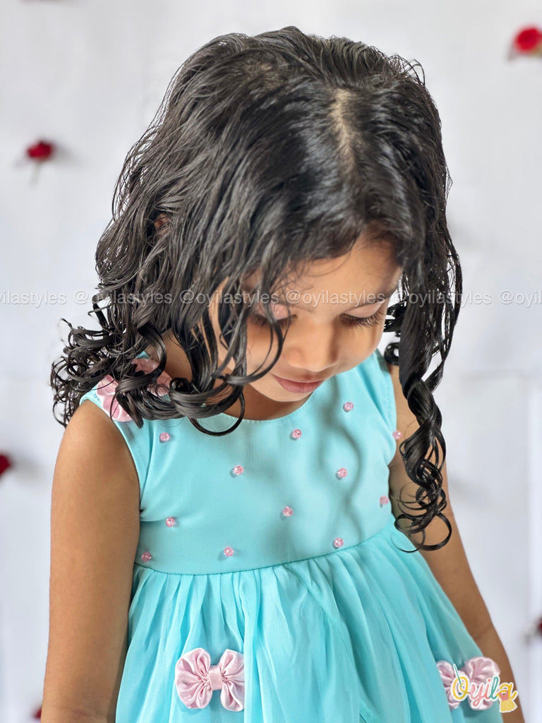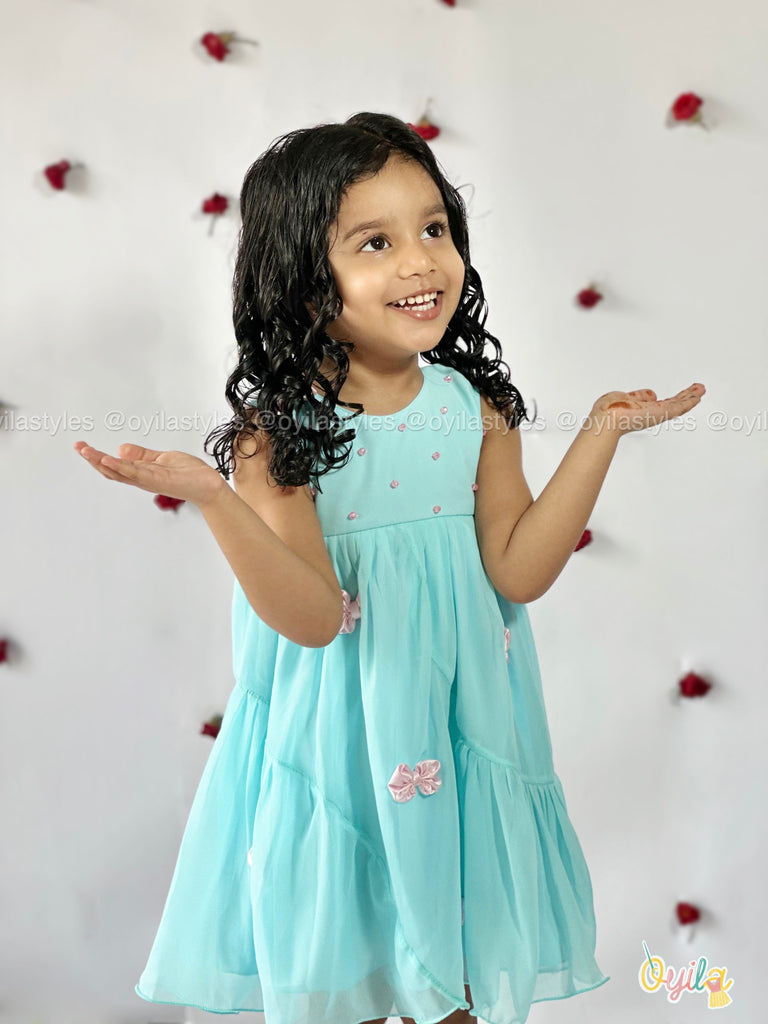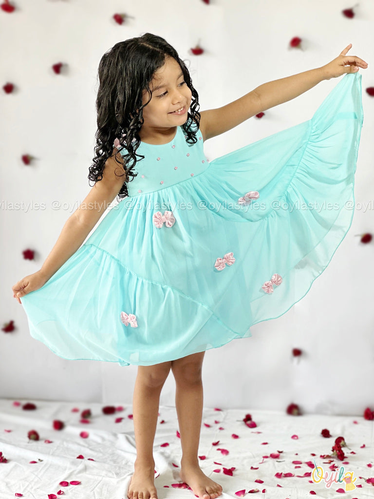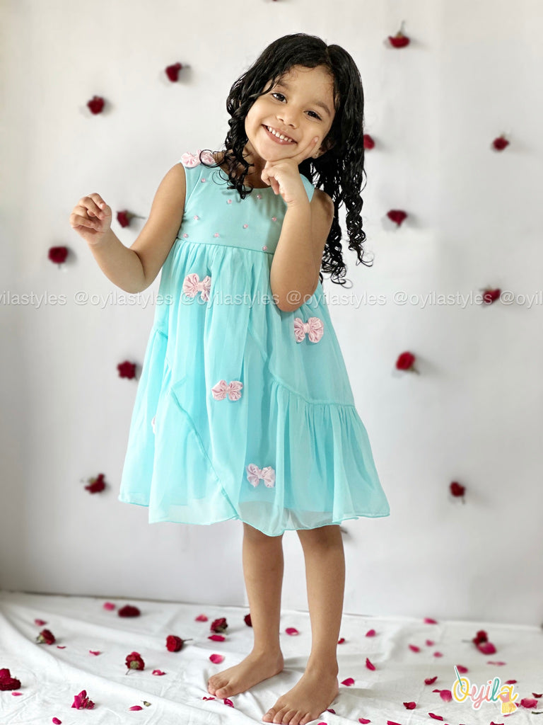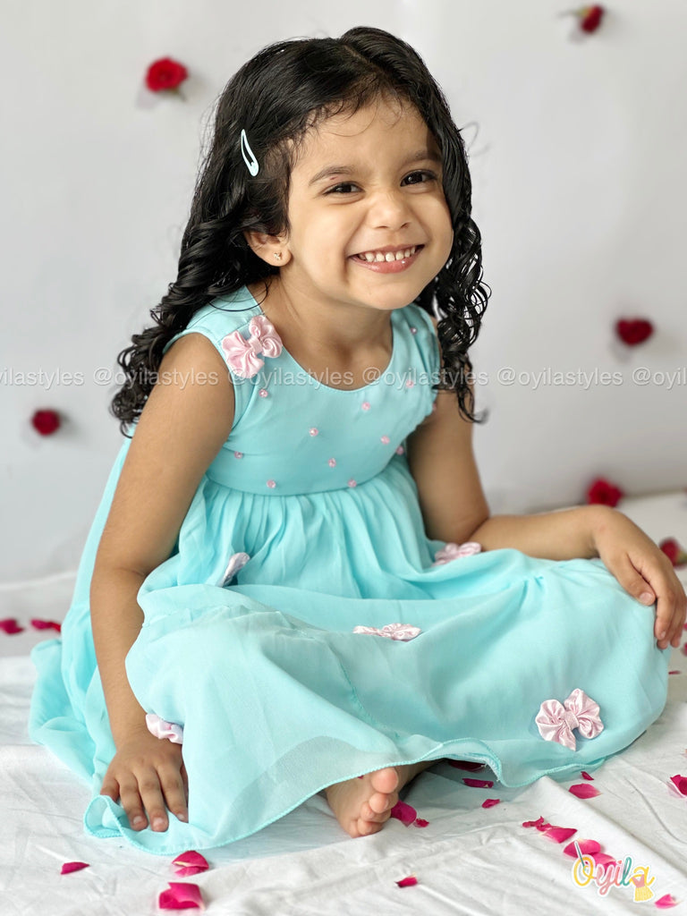 Skye is where simplicity meets sparkle. Crafted in a refreshing aqua blue, this sleeveless dress is perfect for those sunny spring days and carefree twirls. Embellished with soft pink bows and delicate pearls, it captures the joyful spirit of Easter and beyond. Lightweight and lined for comfort, Skye is an easy pick for playdates, parties, or just dancing around the house.