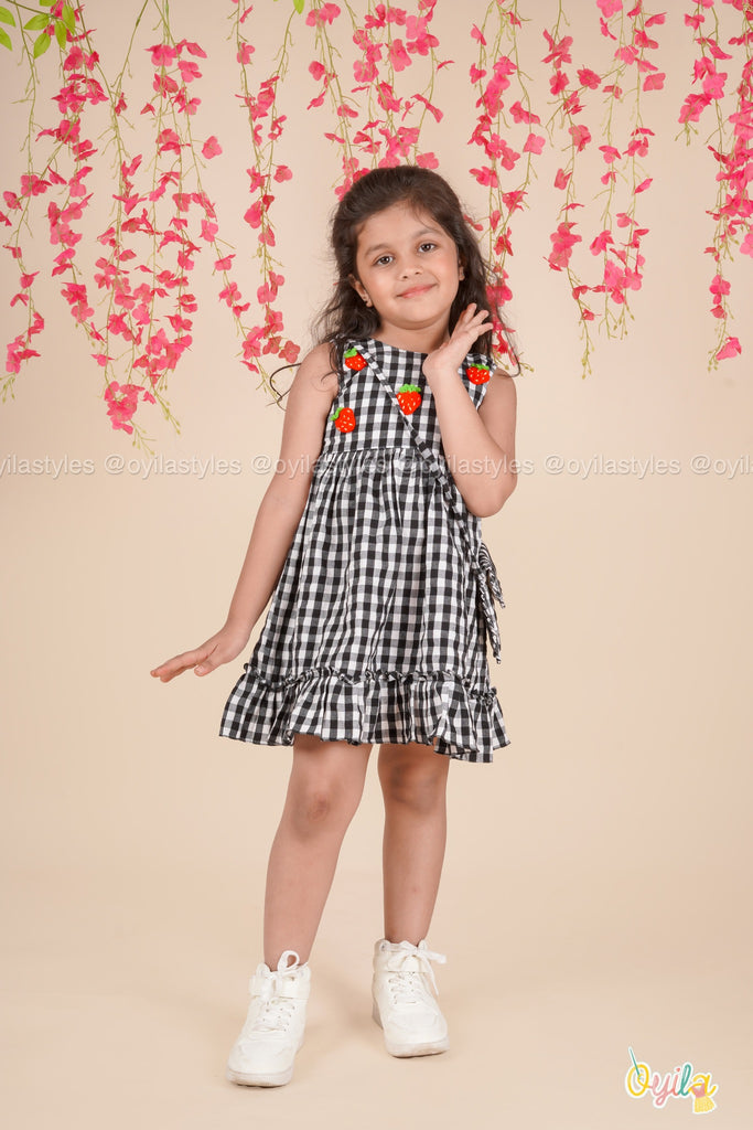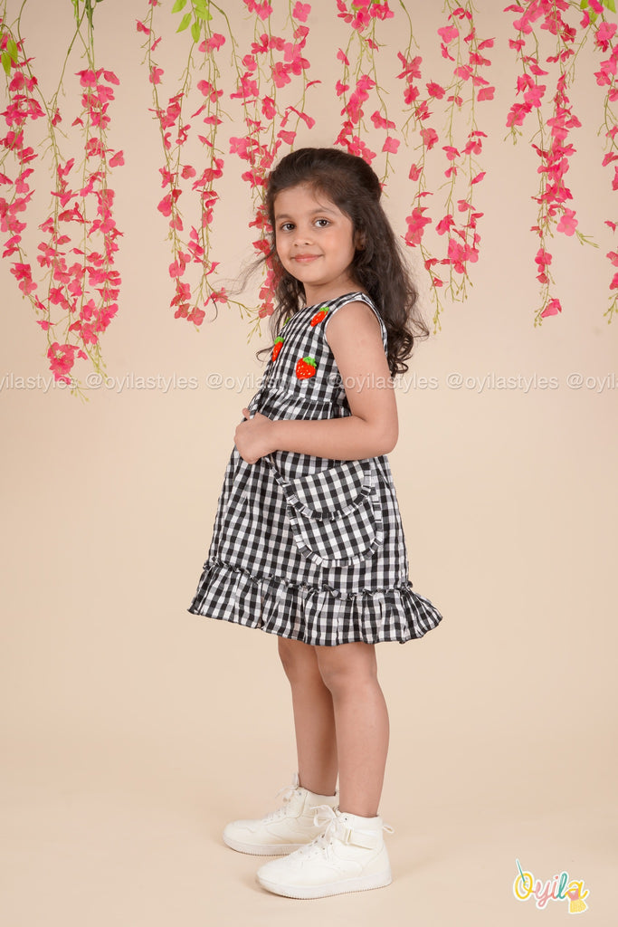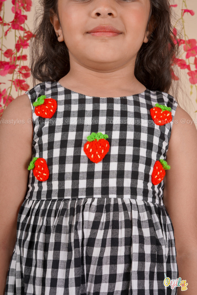 Strawberry Picnic is where classic meets cute! This black-and-white gingham dress features bright strawberry crochet appliqués on the chest, playful side ties, and a frilled hem that adds extra bounce to every step. Made from soft, breathable cotton, it's the perfect blend of fun and comfort — just right for weekend outings, playdates, or park strolls.