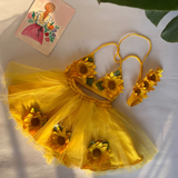 Top: Satin bralette with fabric sunflowersSkirt: Net and satin skirtThe dress is fully cotton lined.Makes a perfect choice for photoshoot costumes.Comes with a headband.