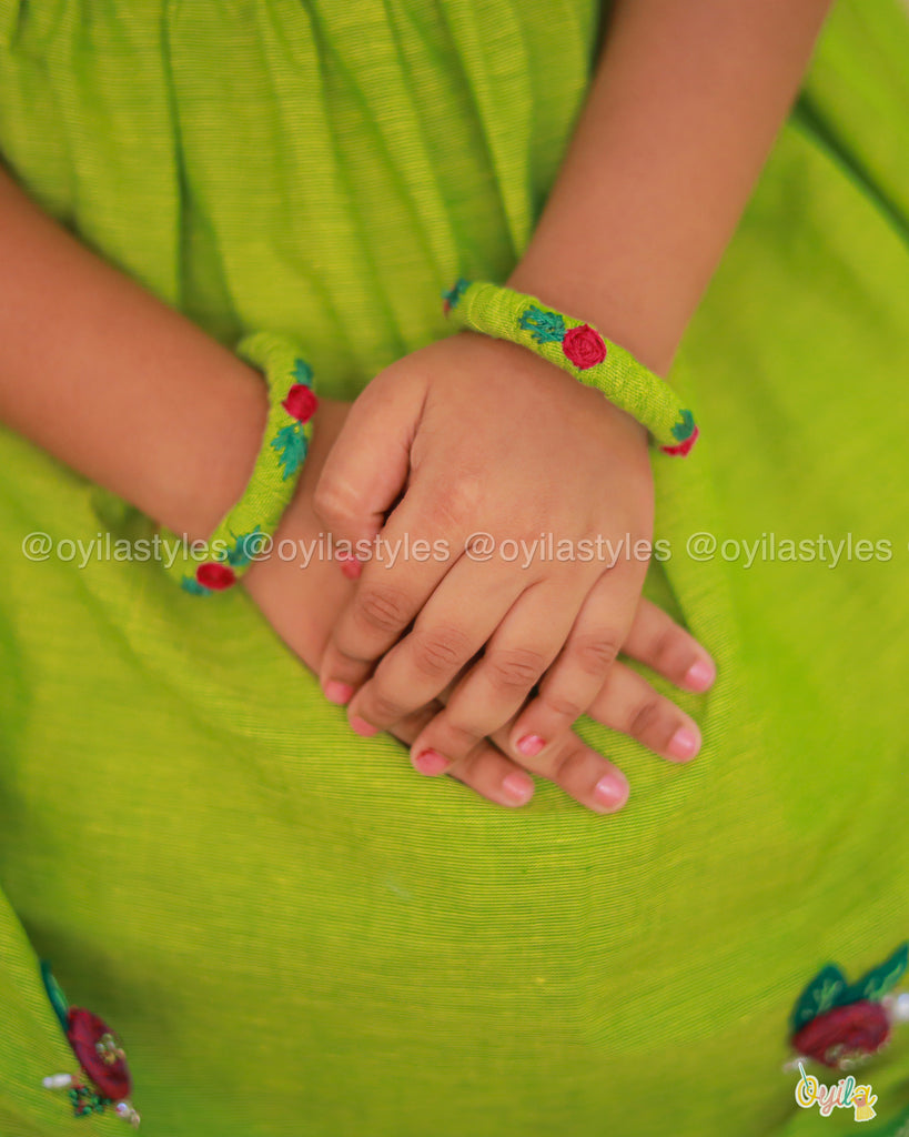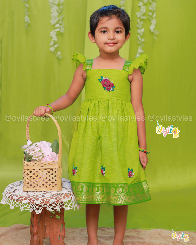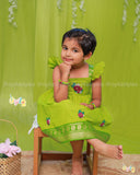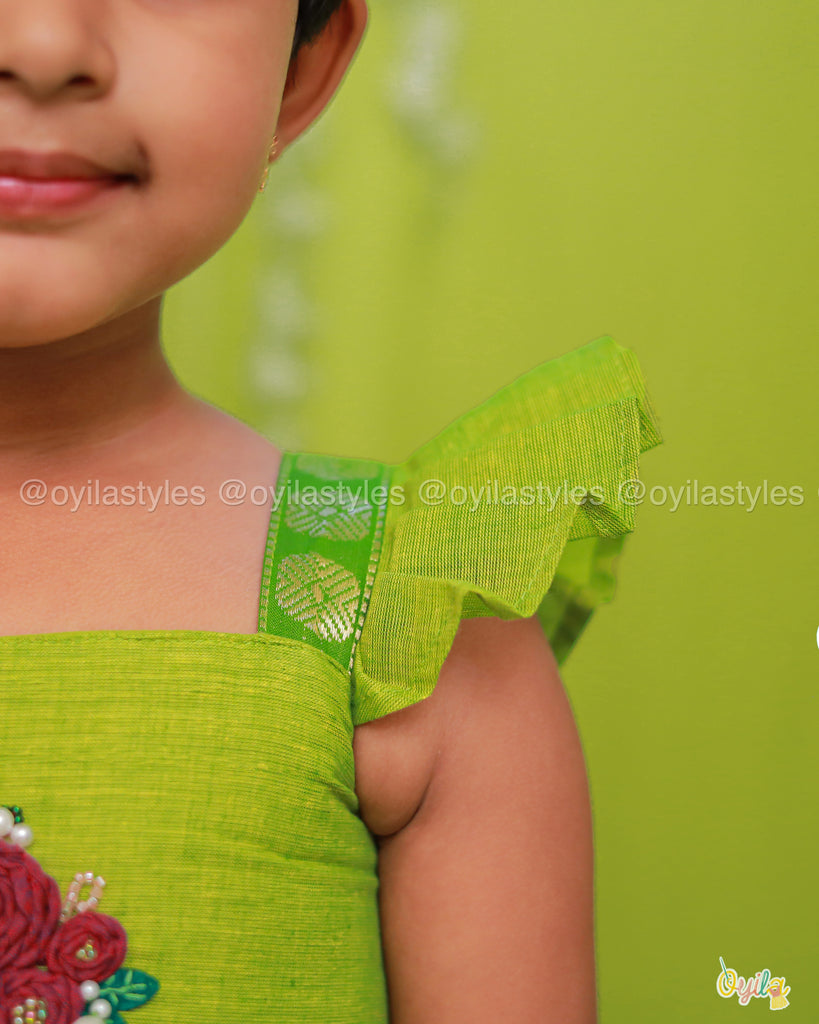 Named after the sacred plant, symbolizing purity and grace, just like the serene green shade of the dress.With its elegant floral embroidery on the bodice and hemline, the dress exudes a youthful charm. The ruffled shoulder straps add a delicate, playful touch, perfect for special occasions or everyday wear.
