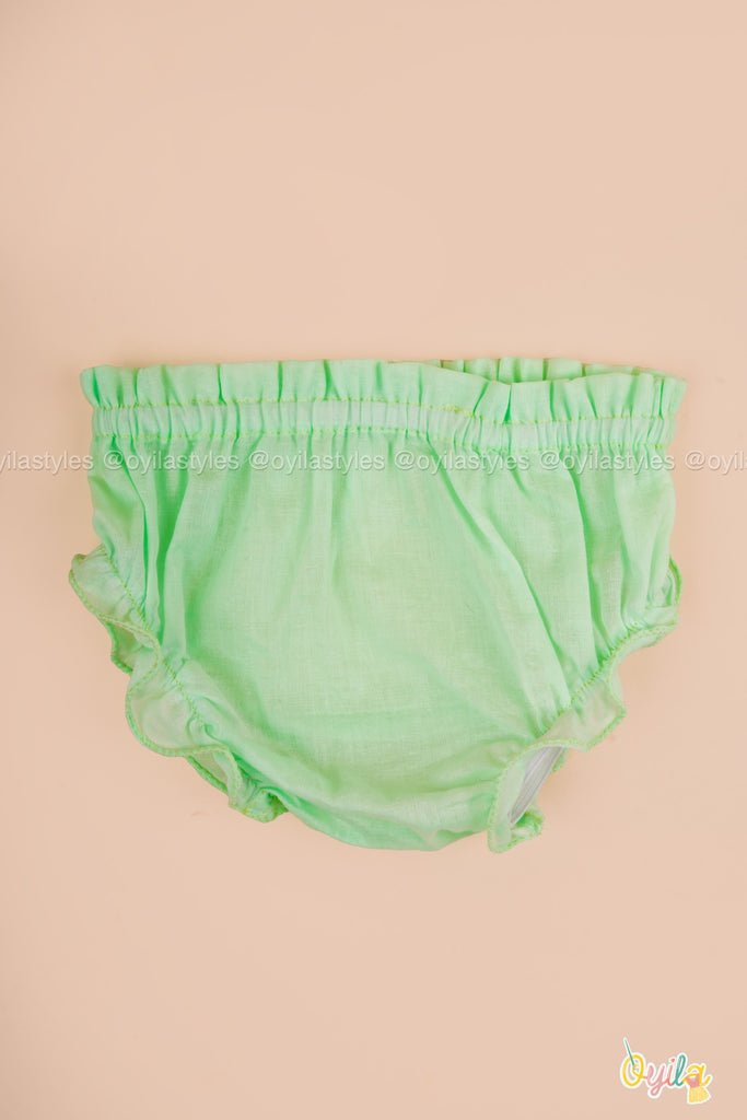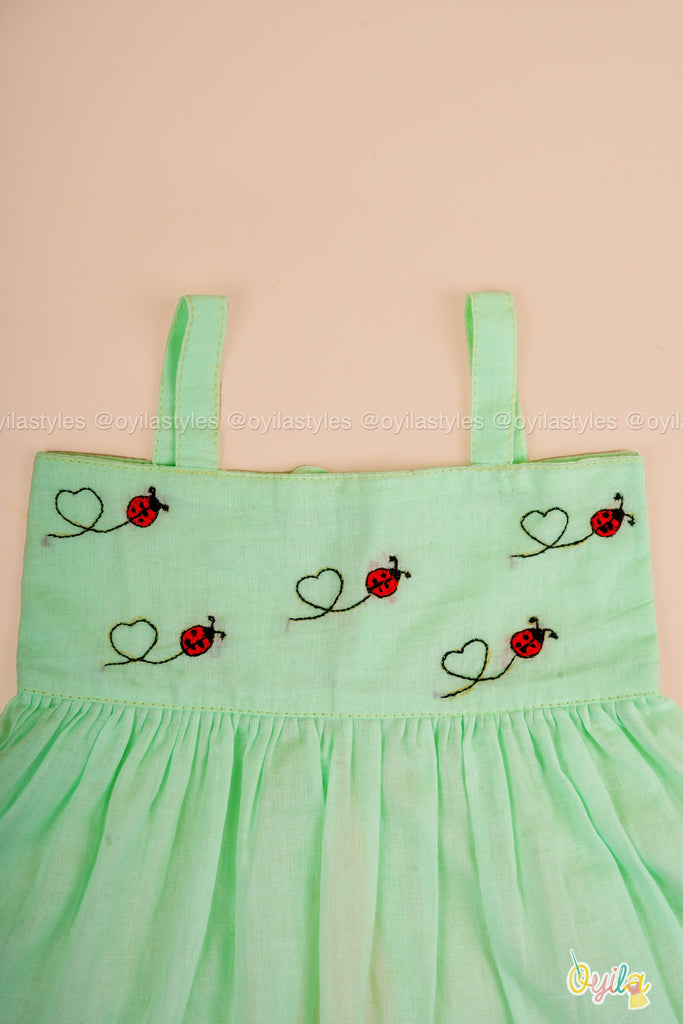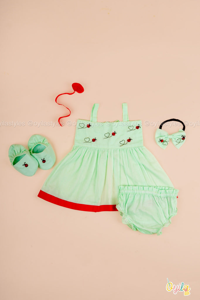 Inspired by nature’s little explorers, Vaigai is a minty delight with red-stitched ladybugs and a soft red hem. This sleeveless dress features thin straps and a breezy fit for your little one to wiggle and giggle in. Paired with a matching bloomer, bow, and comfy shoes – it’s a summer-ready gift set.