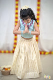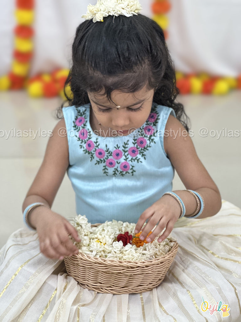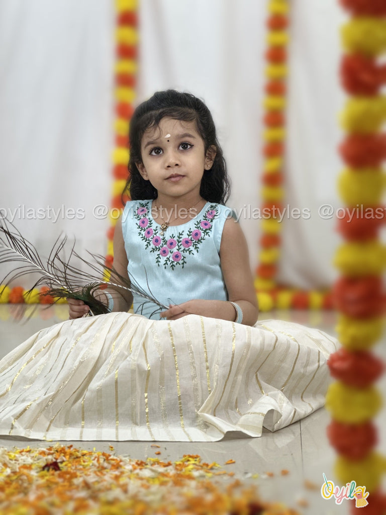 A gentle blend of grace and color, this elegant festive ensemble features a serene sky-blue blouse beautifully embroidered with vibrant pink and purple floral motifs around the neckline. Paired with an ivory pleated skirt adorned with subtle gold stripes, this outfit is perfect for festive mornings, cultural events, or temple visits.